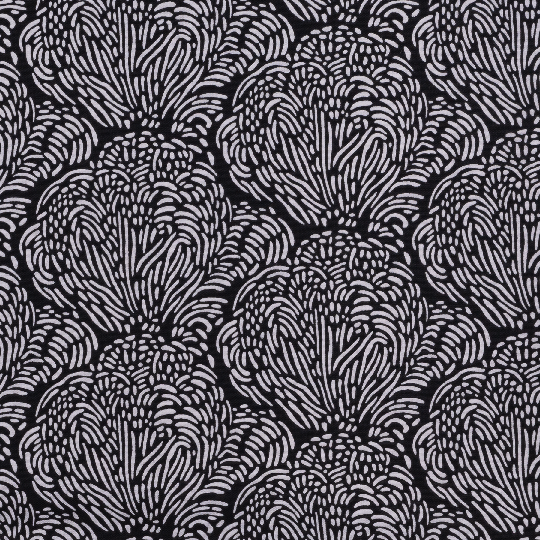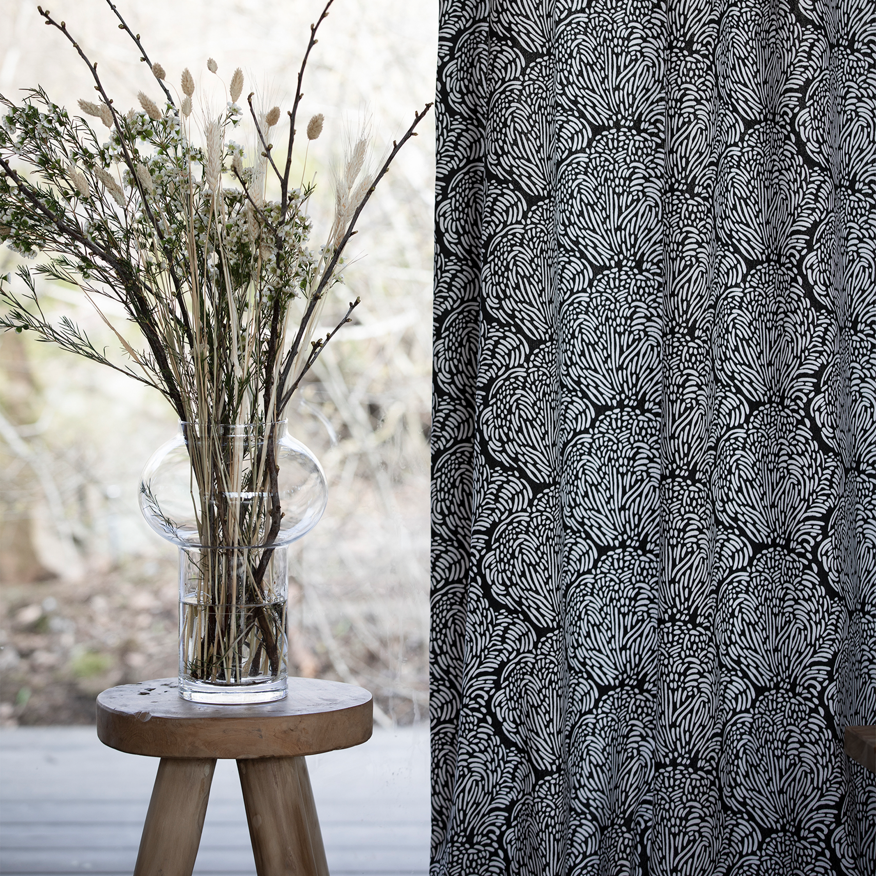 Made of 100 % cotton, black Jäkälä fabric is 150 cm in width. The report size is 32 cm. Wash at 60 degrees. May shrink up to 4 % in the first wash.