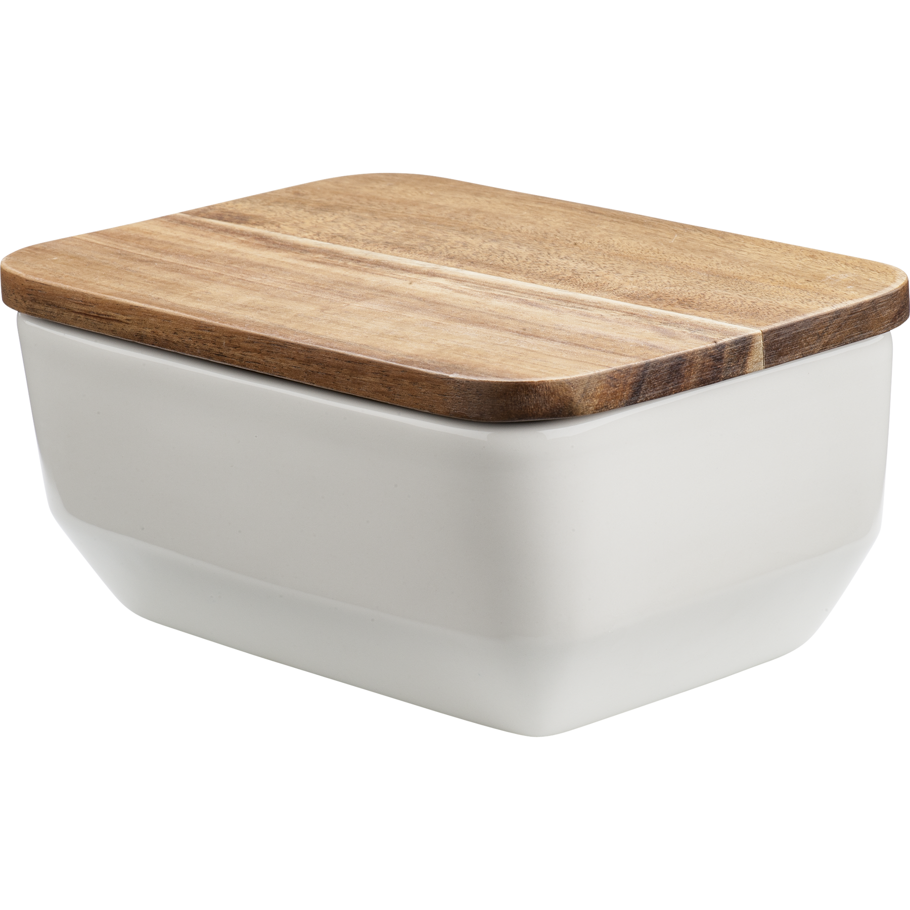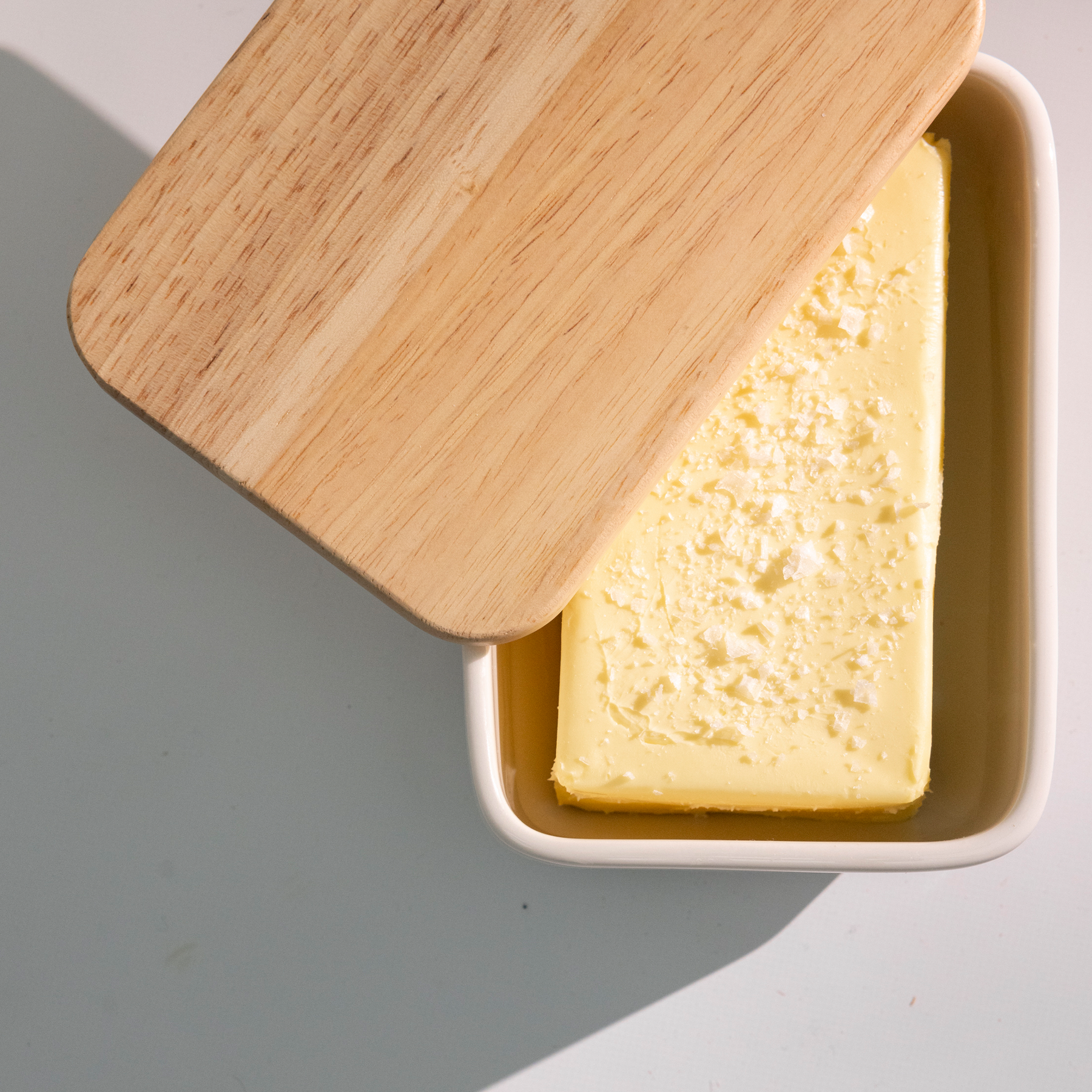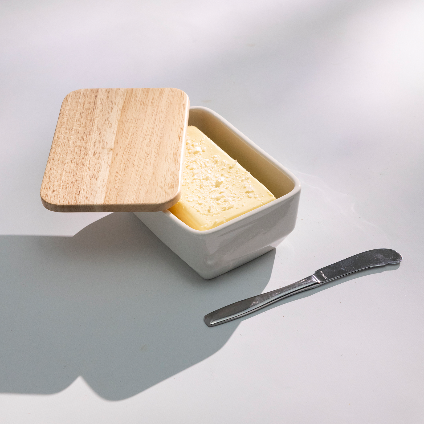 The white ceramic Kallio butter box measures 11,5x16,5 cm and has a lid made of acacia wood. The ceramic butter box is machine-washable and can be used in the electric oven, baking oven, microwave and freezer without any problems. The wooden lid is hand washable.