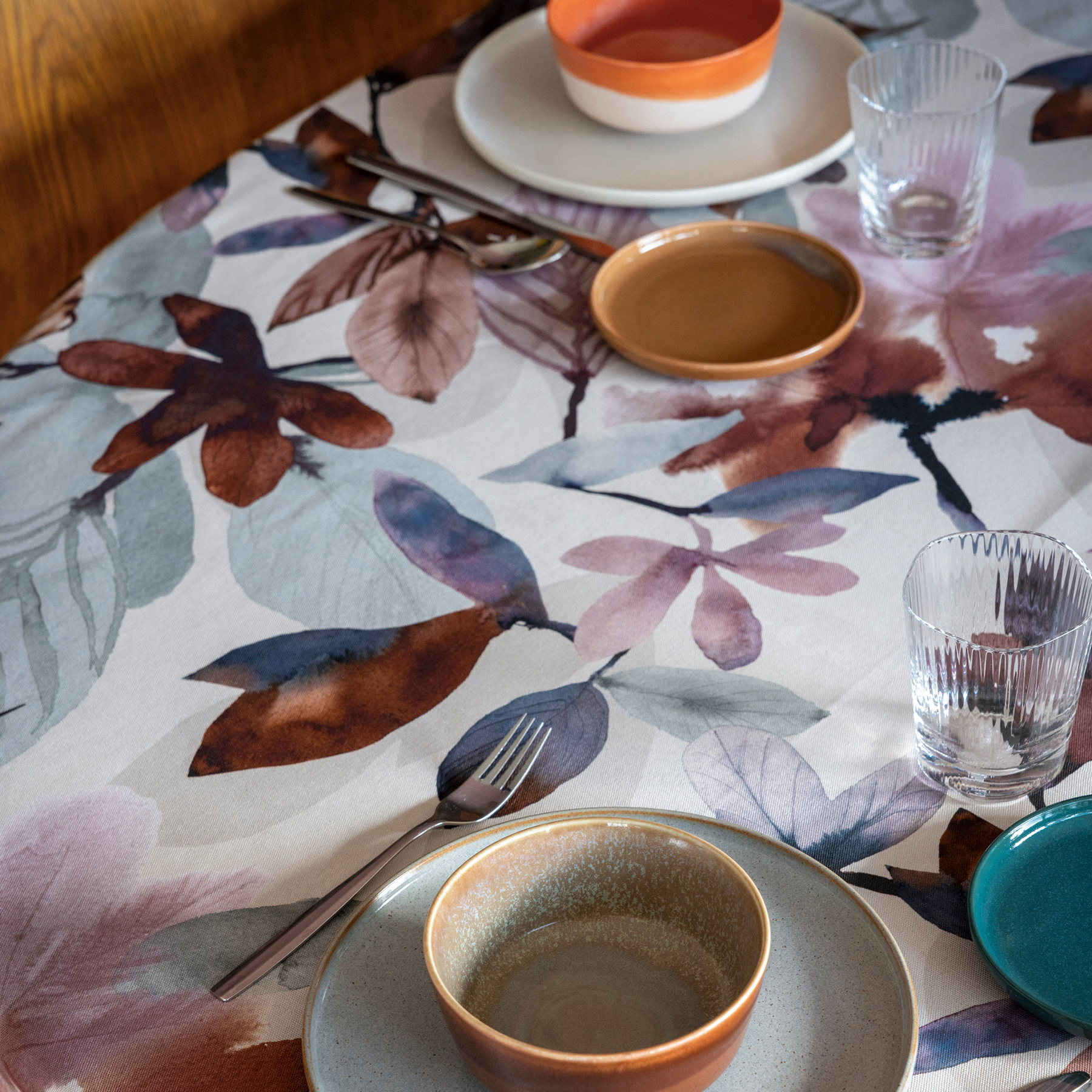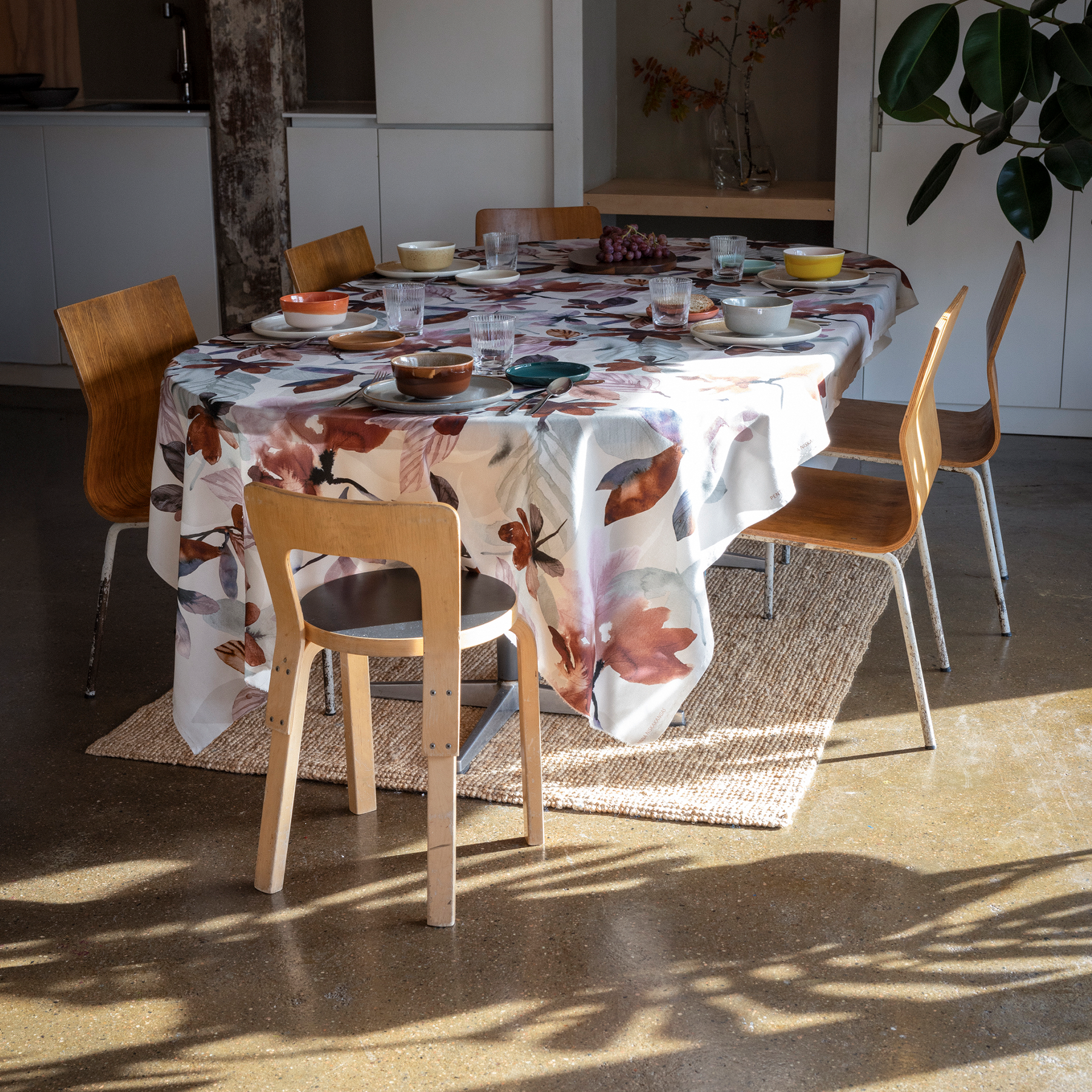 As the leaves float to the ground, a wistful melodic tango begins to play in the back of your mind. Take a cue from the brightly coloured leaves and float into autumn with a light, swirling dance steps. Just like in dancing, there are no limits to creativity in decorating. Trust your instincts and make your home to suit your taste. Minna Niskakangas painted Kastanja (Chestnut) in acrylic paint, combining a strong terracotta brown colour palette with pastel shades. The star-shaped leaves of the chestnut tree float into the home in the form of interior and tableware textiles.