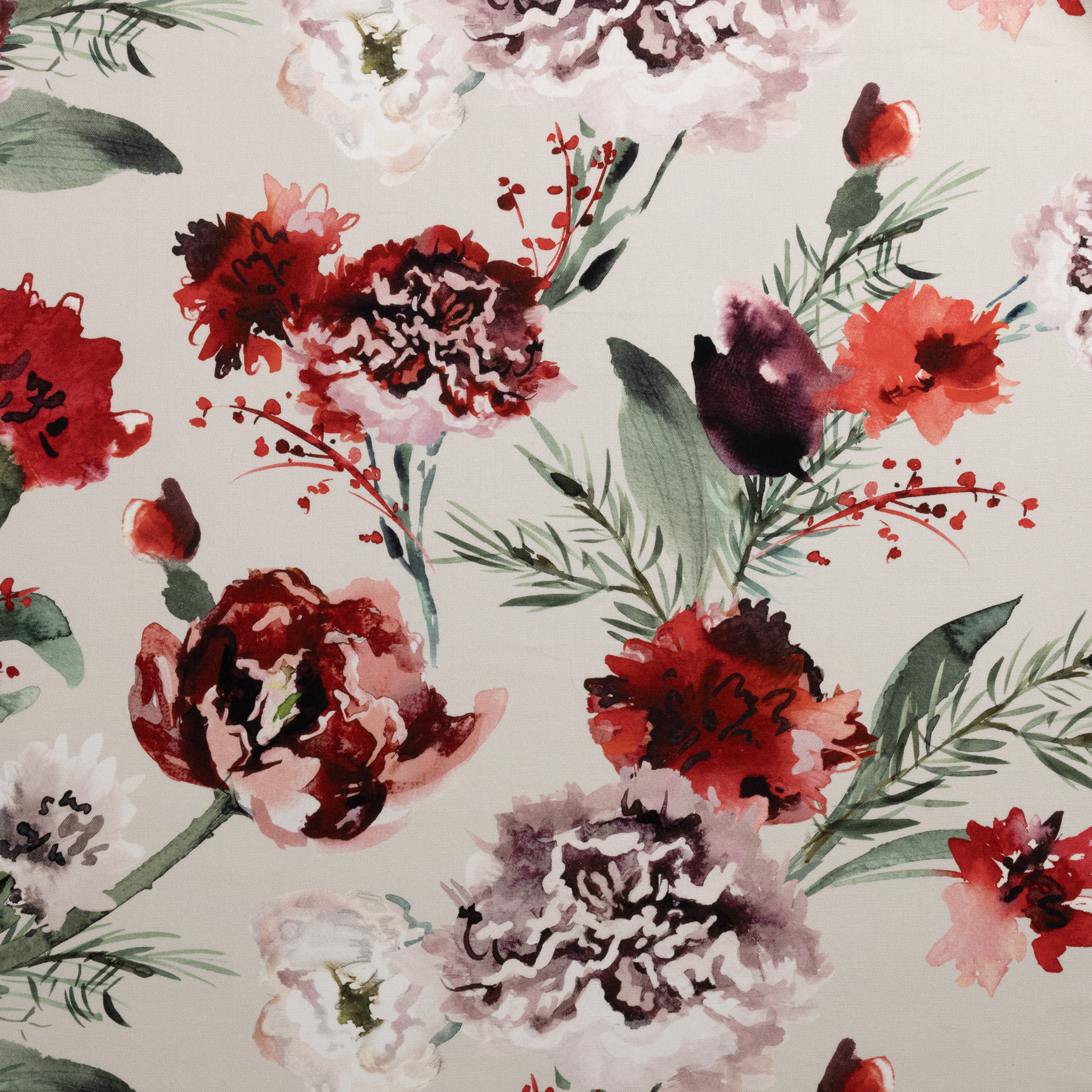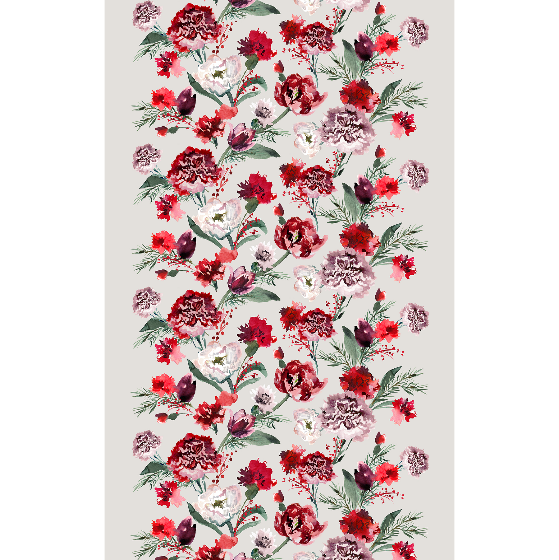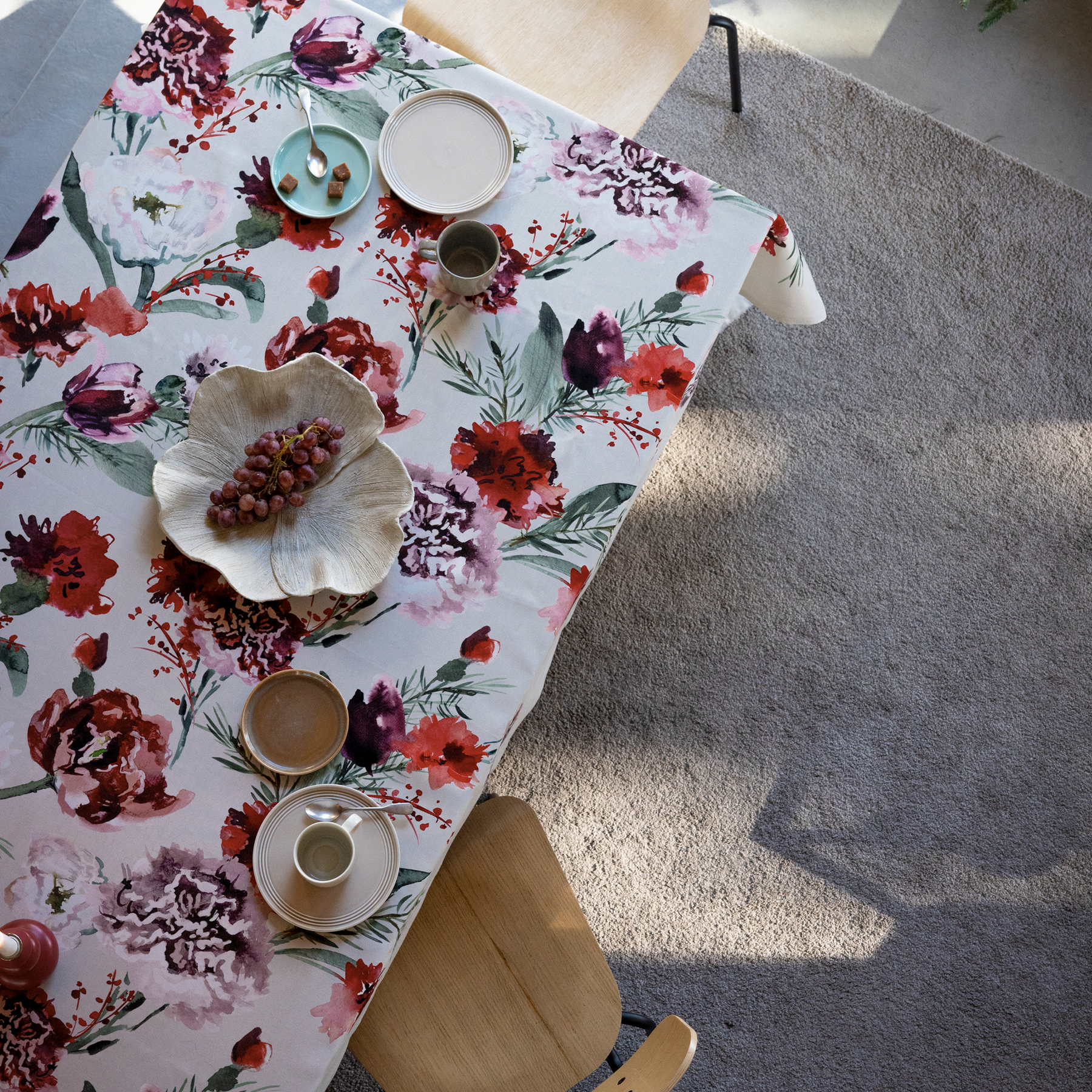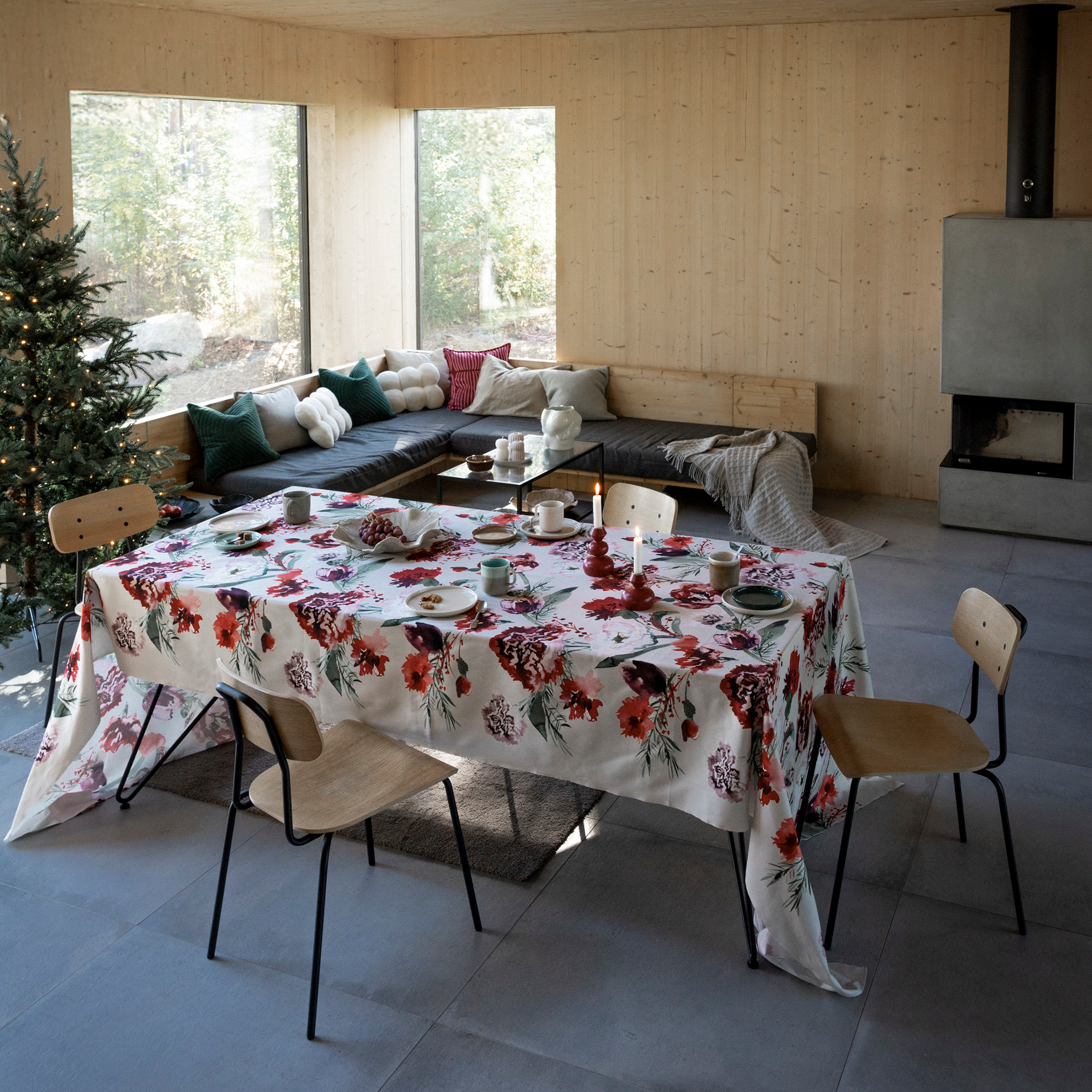 Everyone's Christmas is different. It's built like a casually sprawling bouquet, with flowers of different sizes and colours forming a beautiful whole. In the same way, Christmas is made up of bits and pieces from childhood Christmases, decorations collected over the years and new traditions of our own. When designing the Kimara patterns, Minna Niskakangas went back to her own Christmas memories. The Christmas textiles that bring warmth to the home and dress it up for the festive season are particularly strongly associated with them. Strong colours feel good in the dark season. That's why Minna painted bright red carnations, tulips and berry arrangements in watercolours. Kimara pays homage to tradition, but brings it smoothly into the modern day.