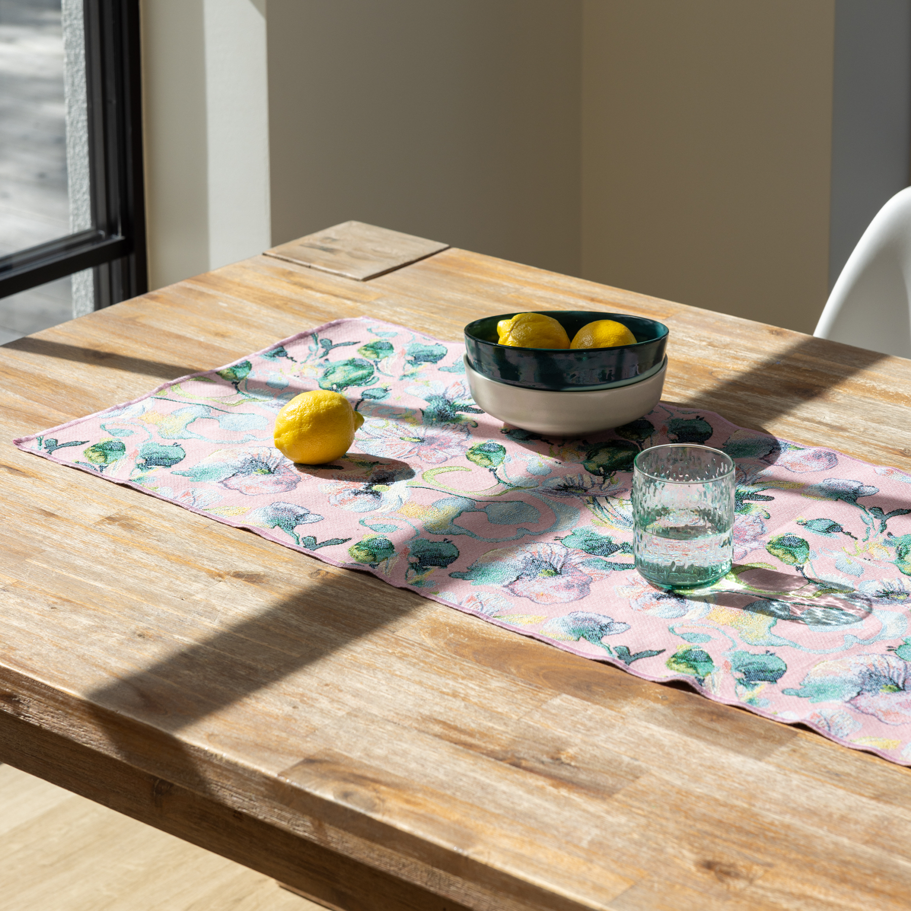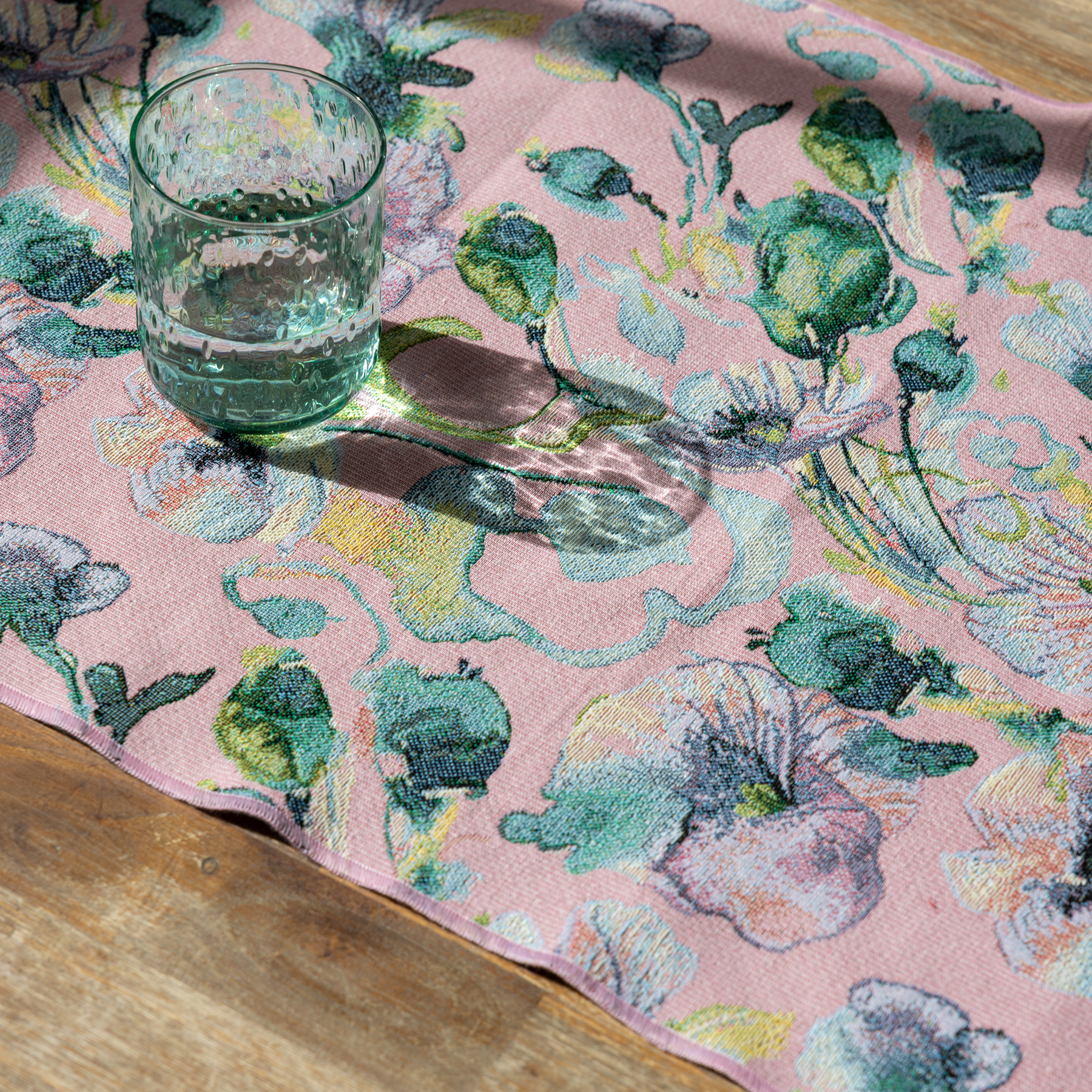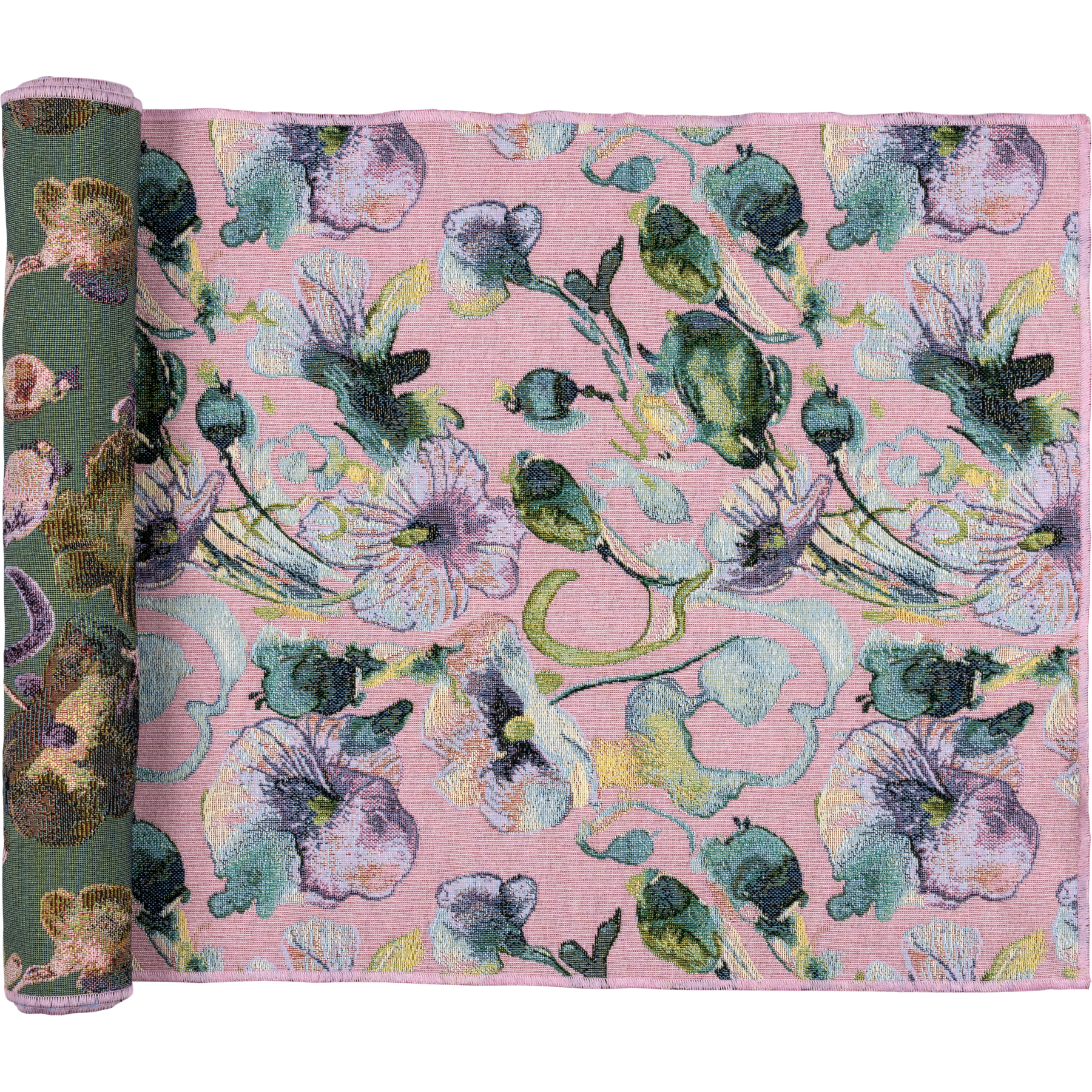 The colourful jacquard runner of the Kukkapelto collection measures 45x160 cm. Made of 60 % polyester (50 % recycled, 50 % regular) and 40 % recycled cotton.