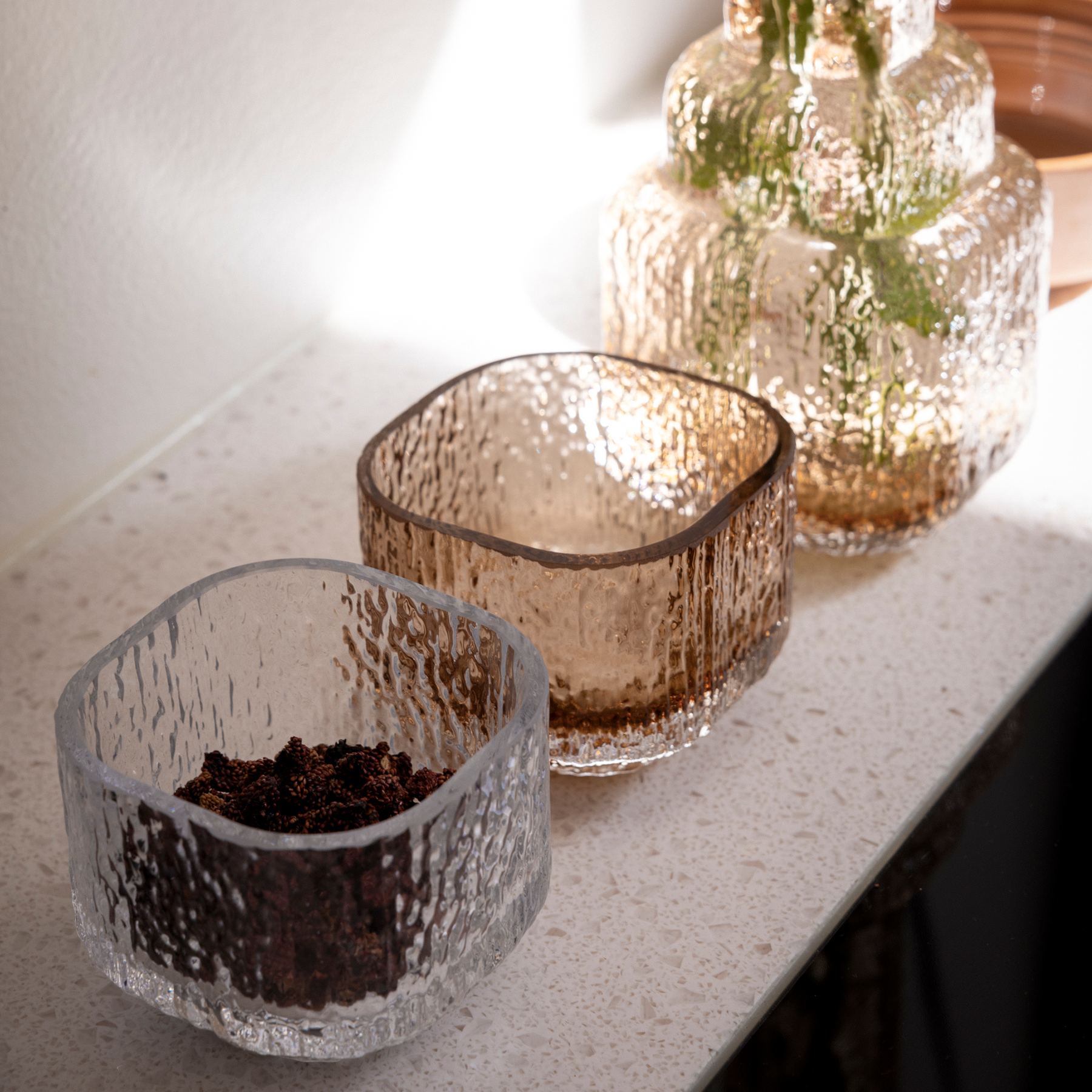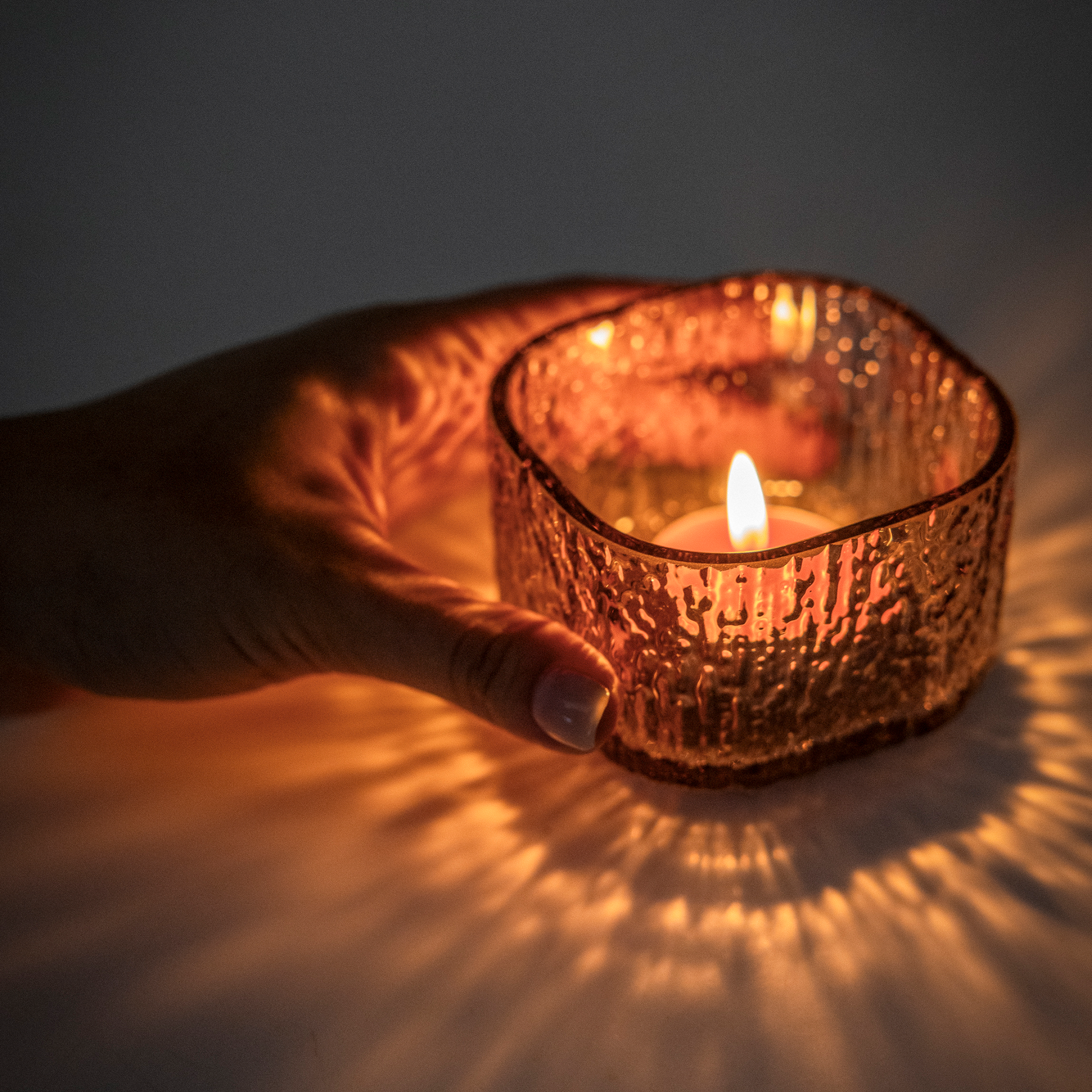 The flickering of candlelight through Kuulea Candle Glass creates a magical atmosphere. Similar to when you’re sitting by the bonfire in the nightfall or when standing on the dock watching the waves playing along the surface of the water. Kuulea series has a distinctive surface pattern that was inspired by raindrops falling on the window. Designed by Tuuli Saarelainen.