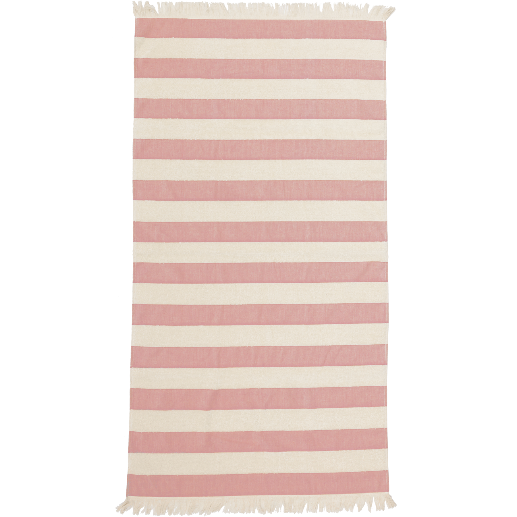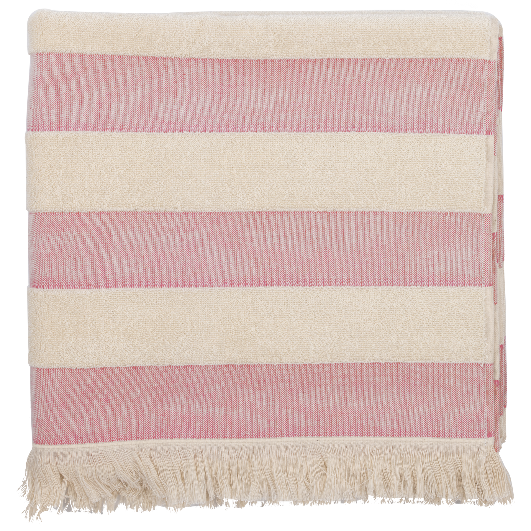 The Majakka bath towel measures 90x150 cm. Material 100% cotton terry. The natural white and coral stripes have different texture.