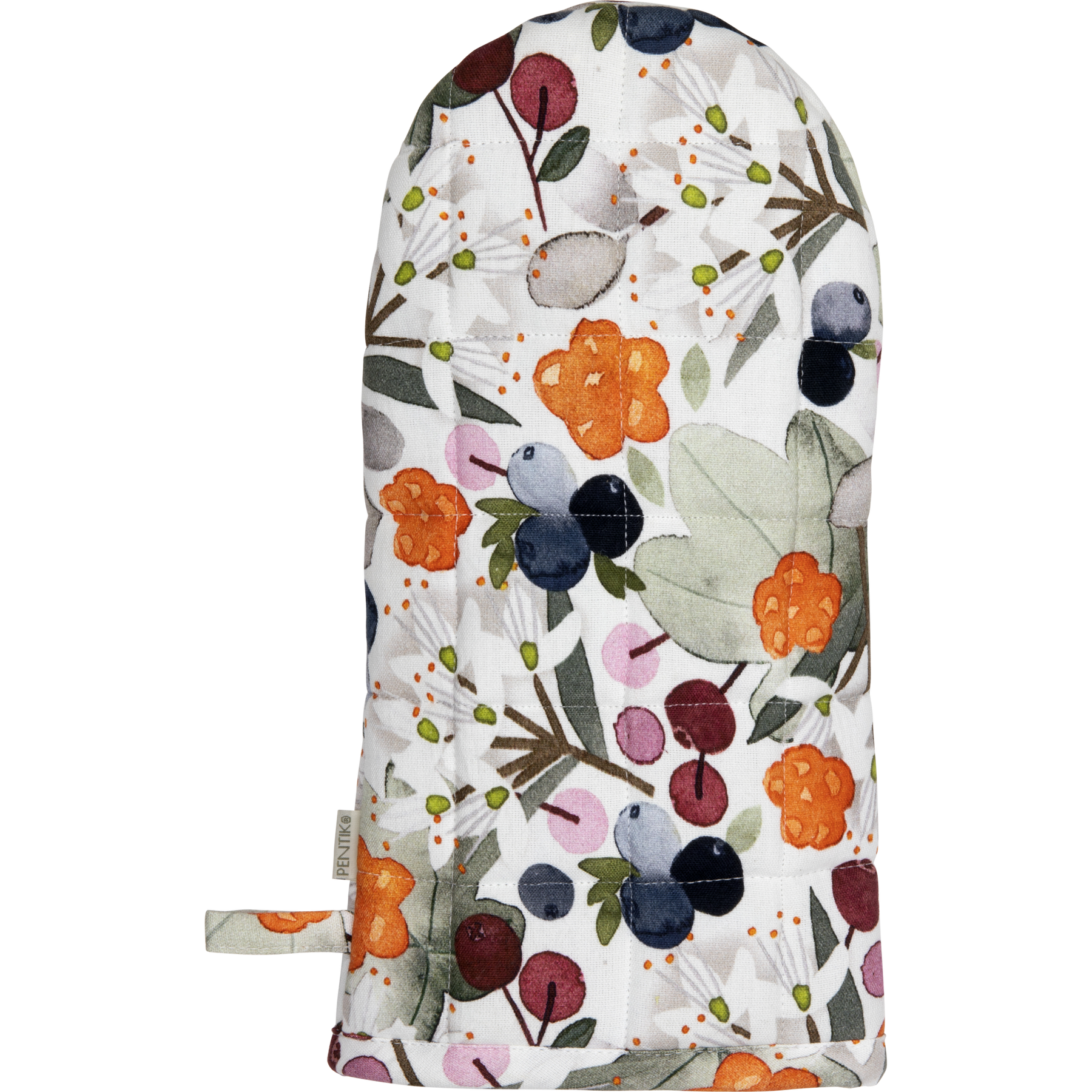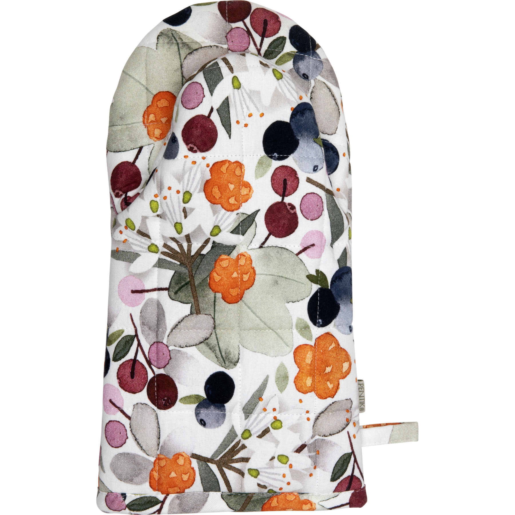 Metsämarja oven mitt is 16x31 cm in size and made of 100 % cotton (the filling is polyester). Wash at 60 degrees.
