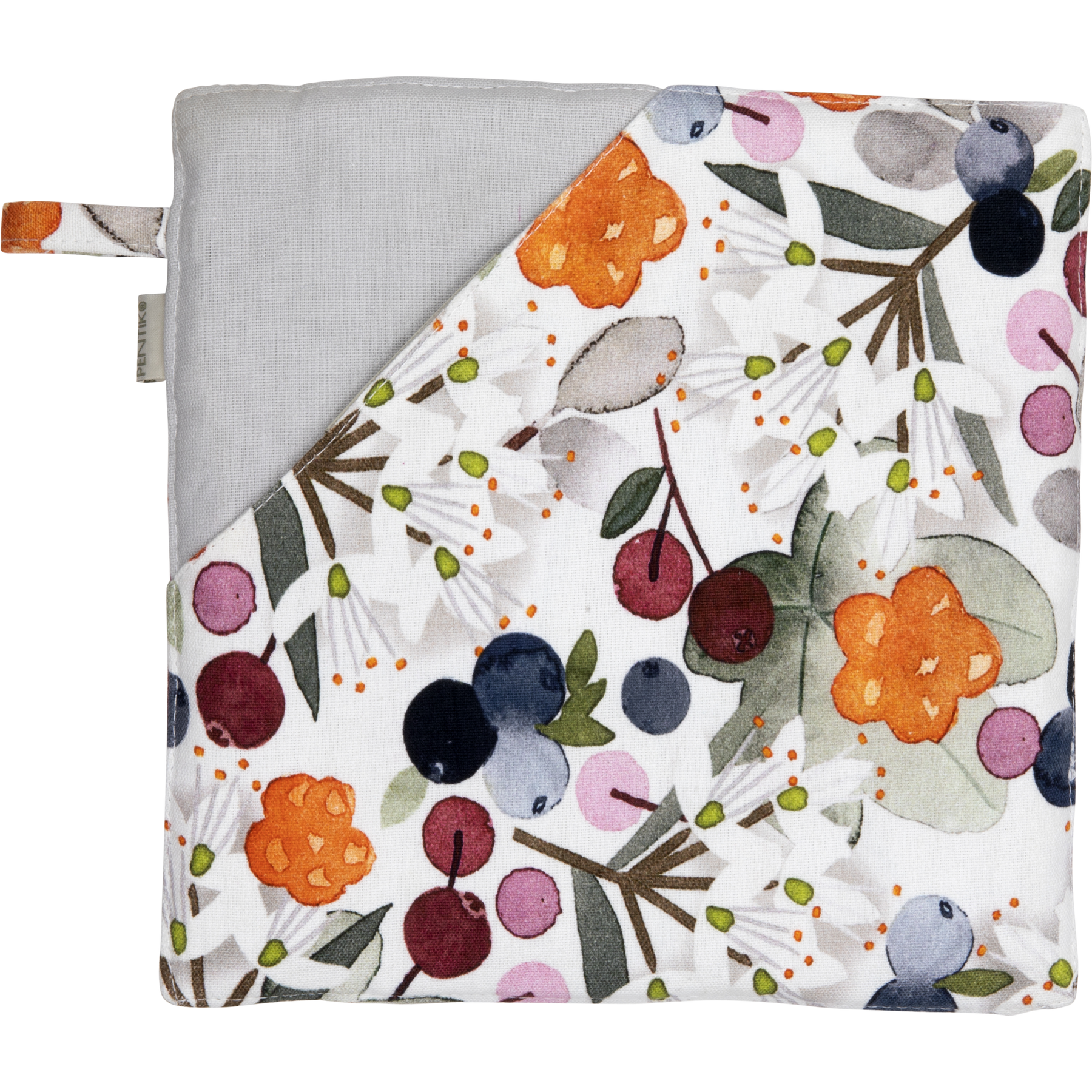 Metsämarja potholder is 21x21 cm in size and made of 100 % cotton (the filling is polyester). Wash at 60 degrees.