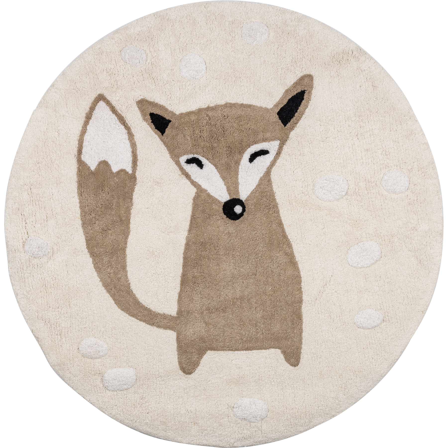 The light brown Metsänväki Kettu mat has a diameter of 100 cm and it is made of 90 % cotton and 10 % mixed yarn.