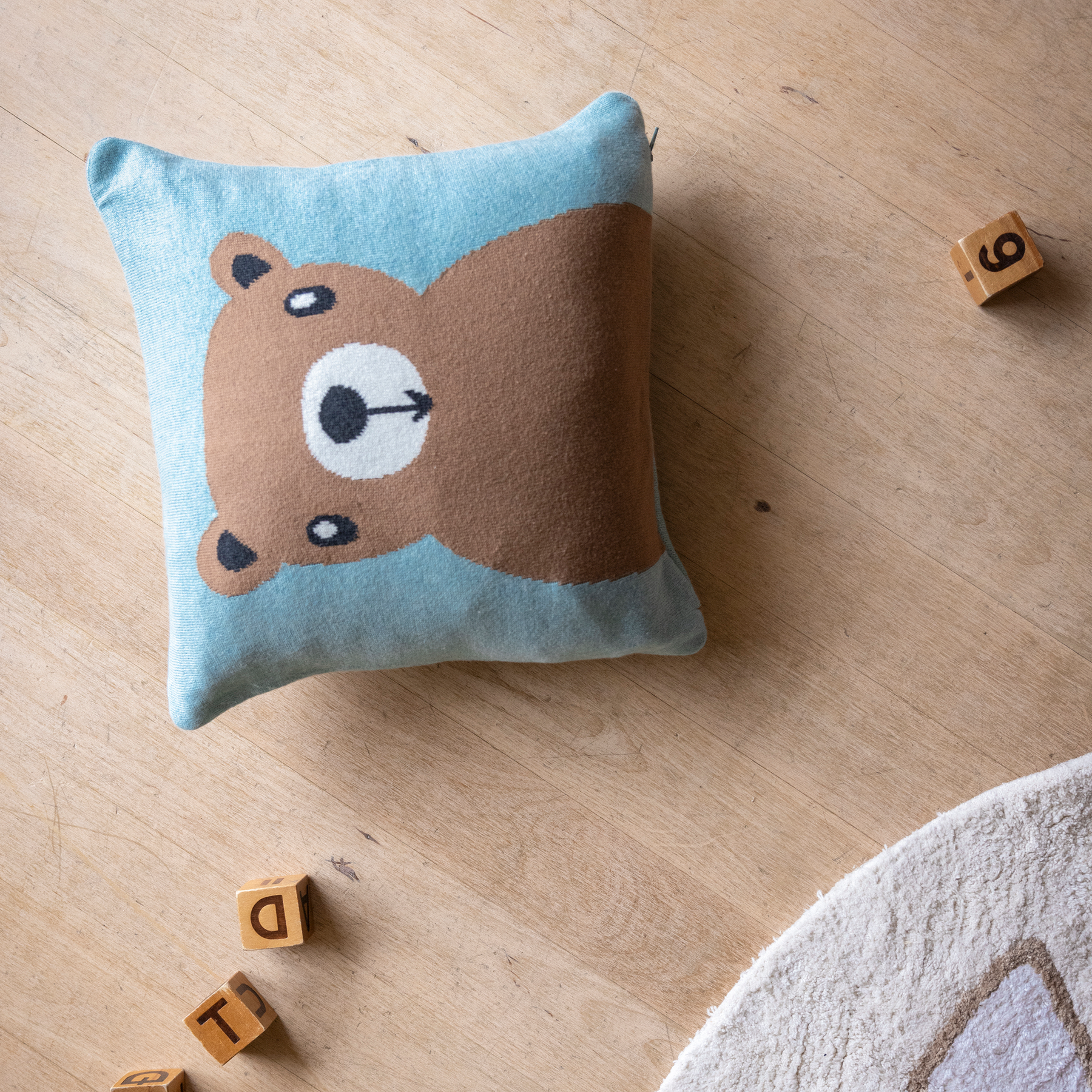 The Nalle (Teddy Bear) cushion cover is made of 100 % cotton and is 35x35 cm in size so it is perfect with Pentik's 36x36 cm inner cushion, which will make the cushion look full with no extra space in the corners.