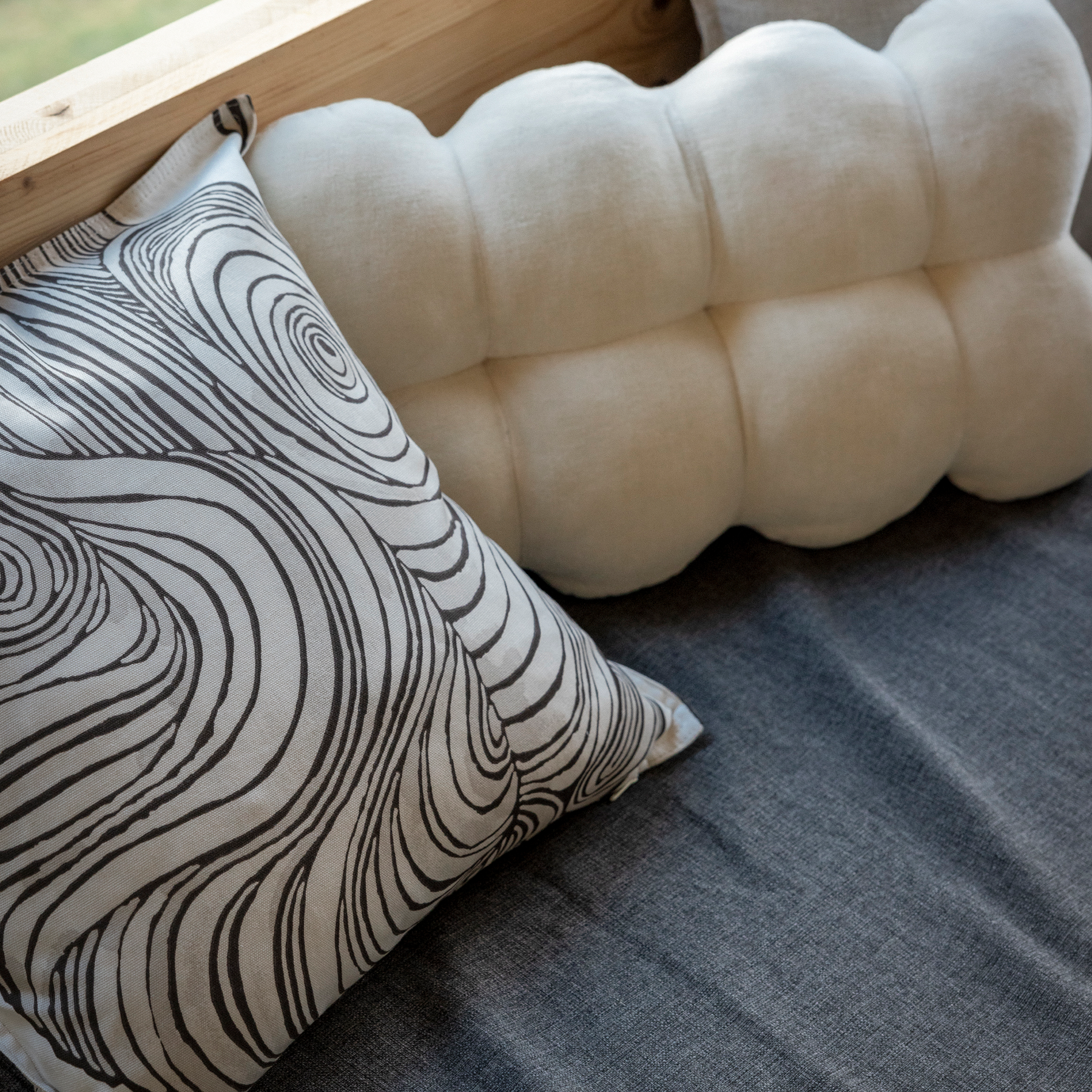 In the hands of a designer, the details of nature become art. The Pahka (Gnarl) collection was created by Lasse Kovanen at the ceramics factory in Posio. He designed the shapes using a traditional sculpting method, carving them out of plaster. The swirling shapes of gnarls growing on tree trunks were then drawn into modern textile patterns. The sculptural fabrics, cushion covers and ceramic vases of the collection bring a forest-like and earthy atmosphere into the home.