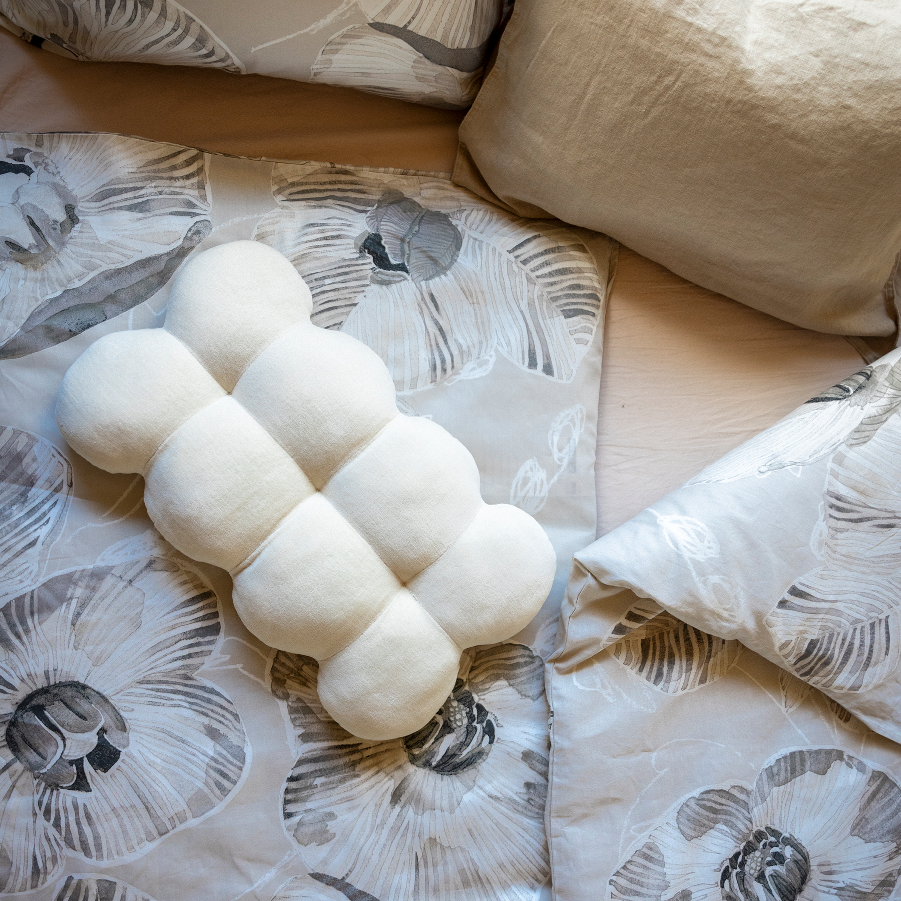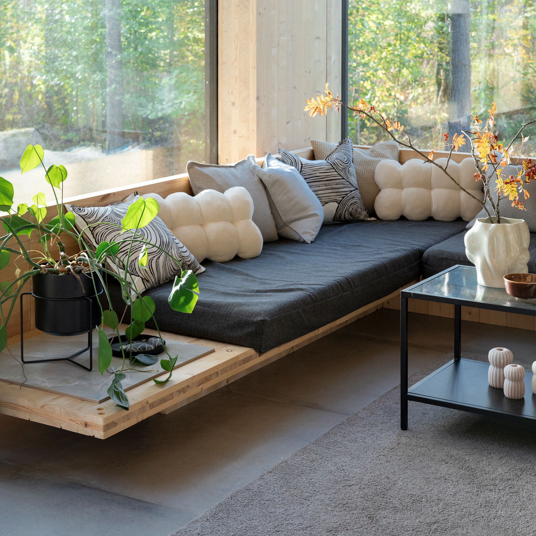 In the hands of a designer, the details of nature become art. The Pahka (Gnarl) collection was created by Lasse Kovanen at the ceramics factory in Posio. He designed the shapes using a traditional sculpting method, carving them out of plaster. The swirling shapes of gnarls growing on tree trunks were then drawn into modern textile patterns. The sculptural fabrics, cushion covers and ceramic vases of the collection bring a forest-like and earthy atmosphere into the home.