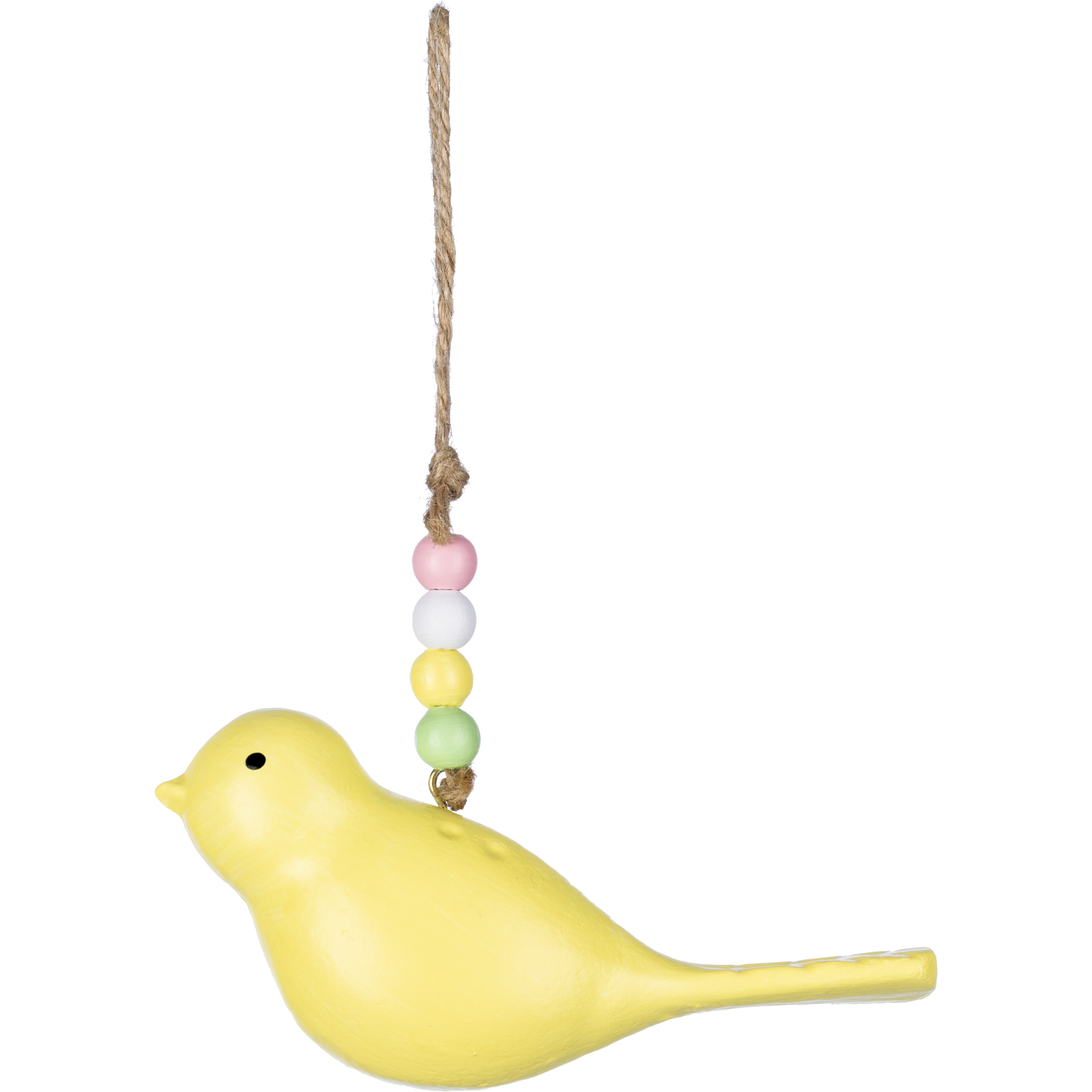 The yellow Pajulintu decoration is made of wood and measures 12 cm. The hanging string is decorated with different coloured wooden beads.
