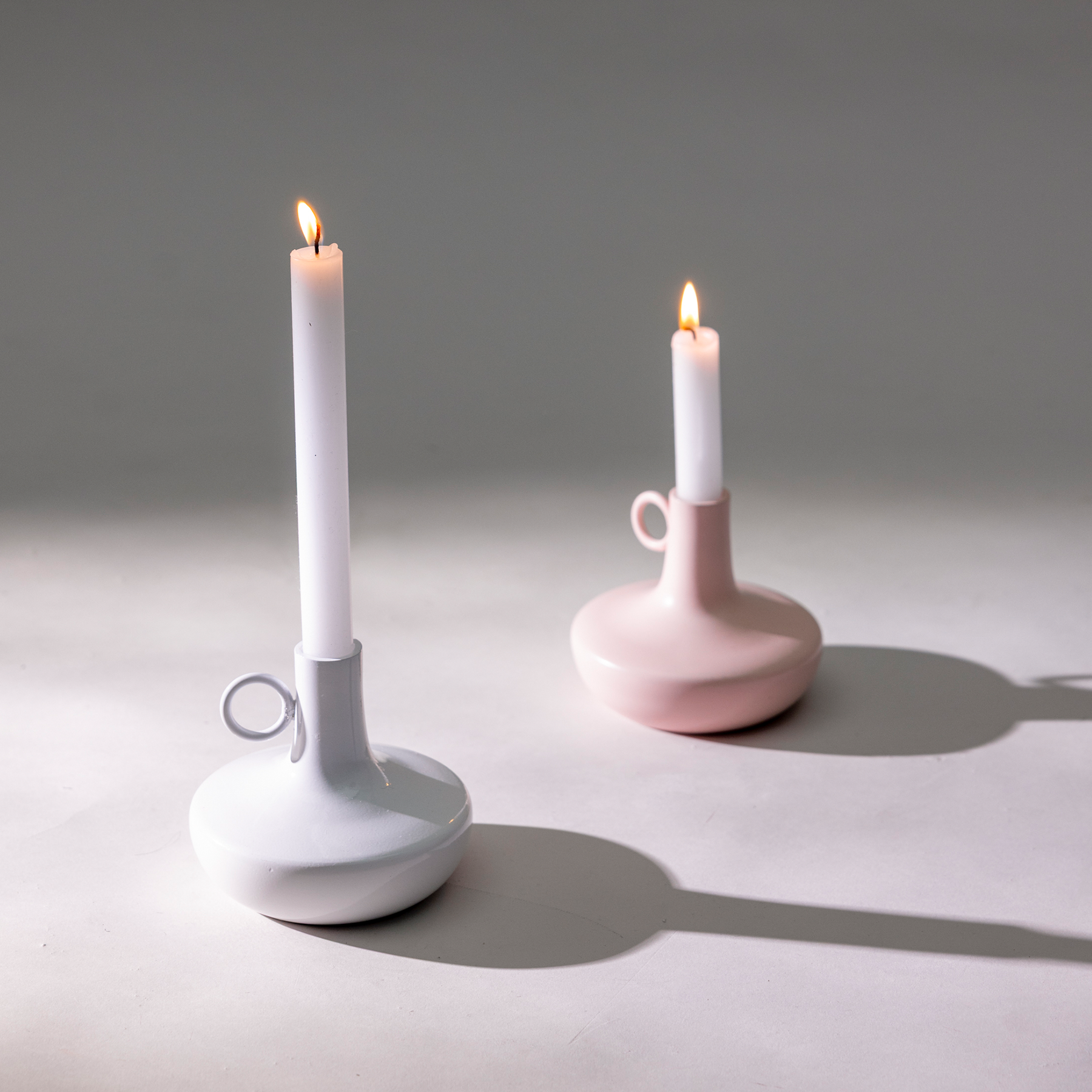 Create a lovely glow and warm atmosphere with the beautifully round shaped Polkka candleholder. The aluminium candleholder is painted white and fits a classic dinner candle.