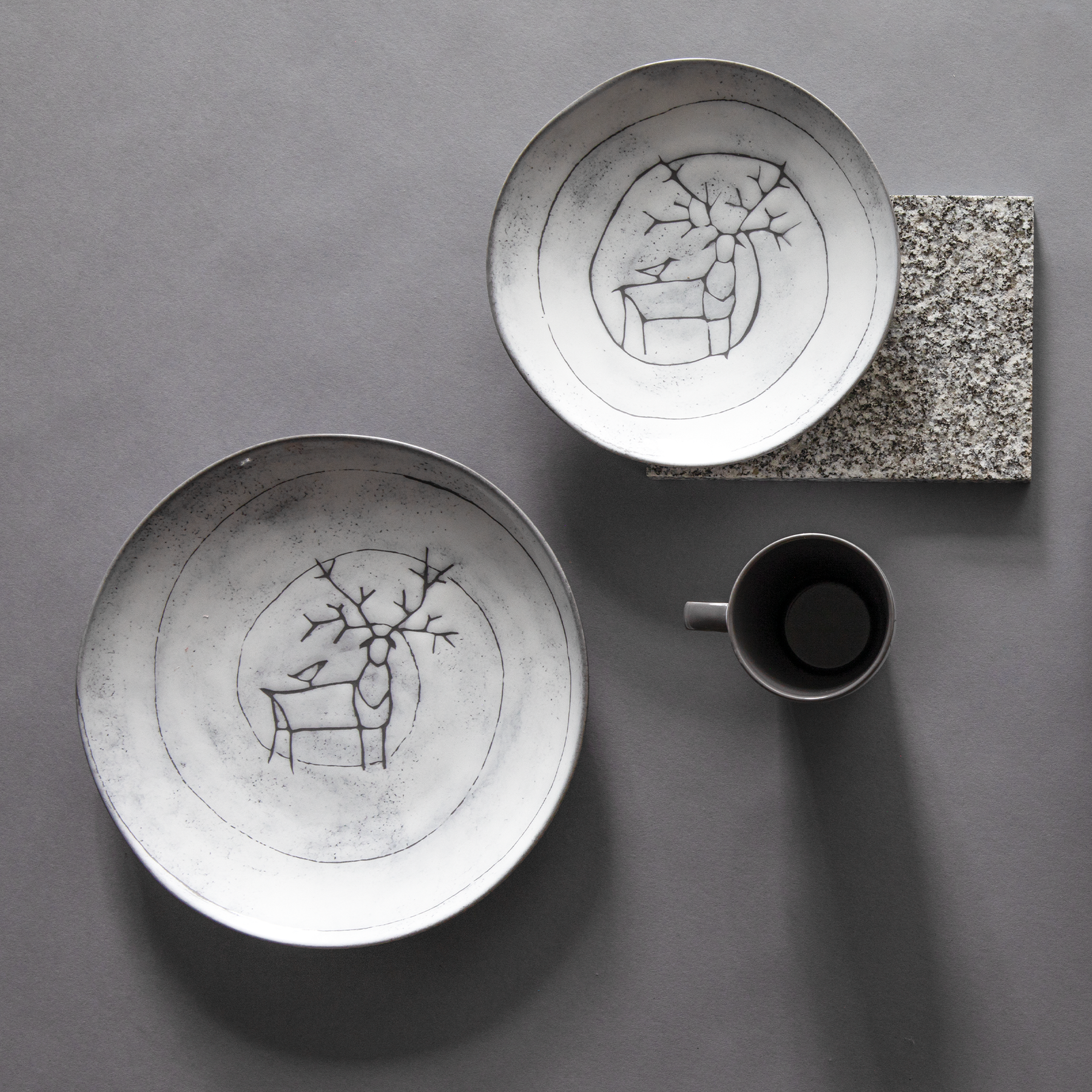 The world's northernmost ceramic factory is located in Posio, Lapland. Since there are more reindeer than people in Posio, these curious animals are sometimes seen peeking through the factory windows. Like all tableware in Posio series, this plate is decorated by reindeer. Made in Posio, the northernmost ceramics factory in the world.
