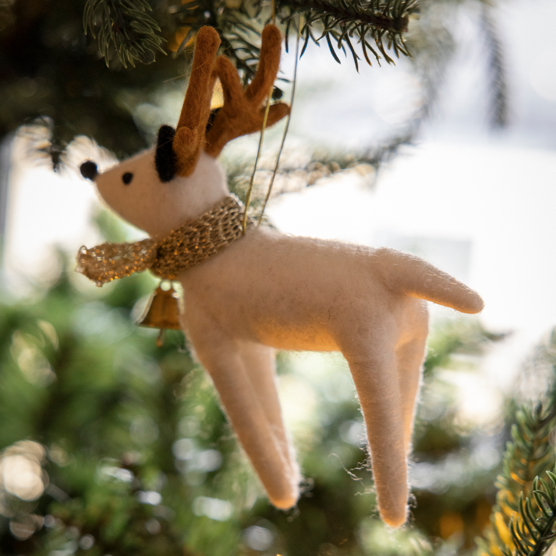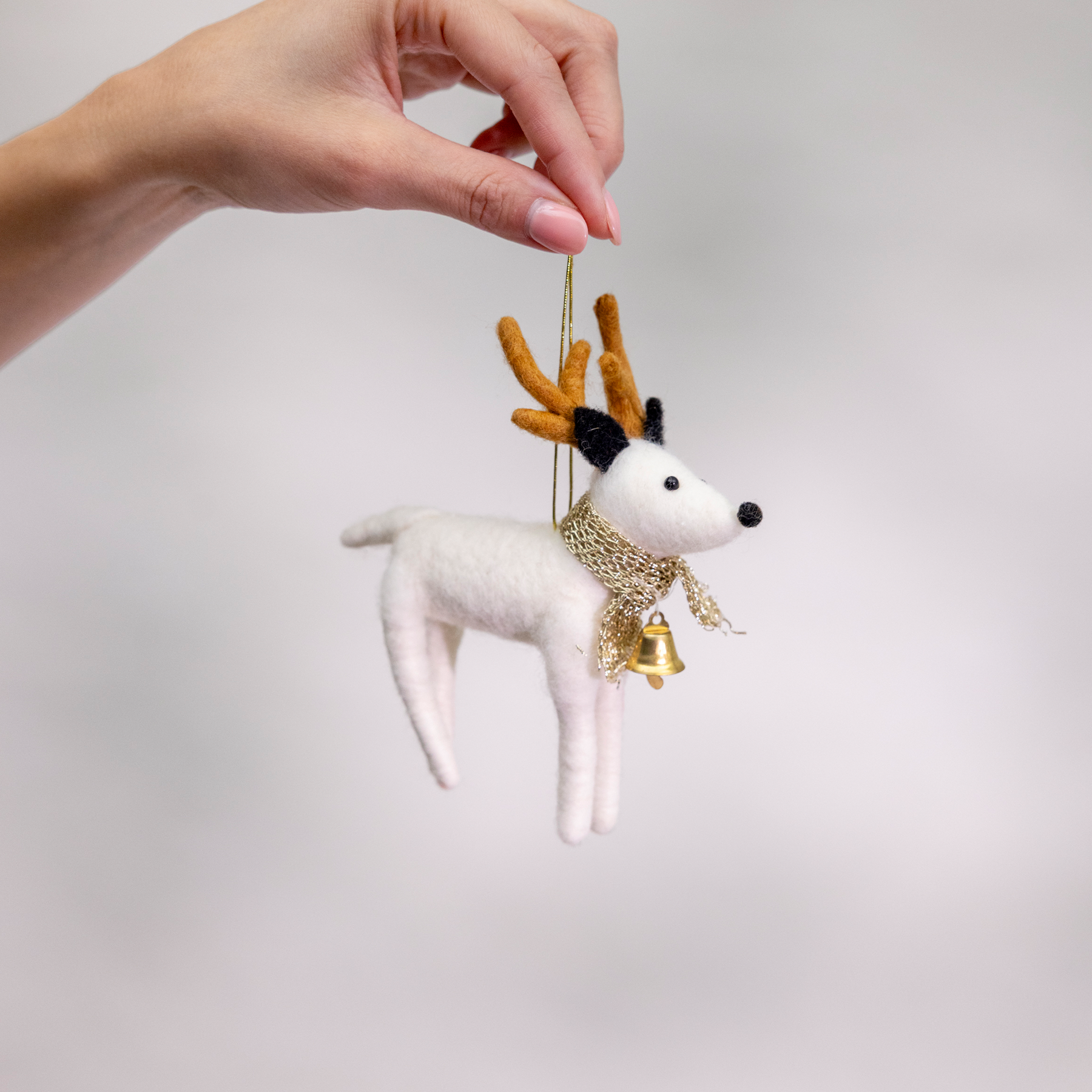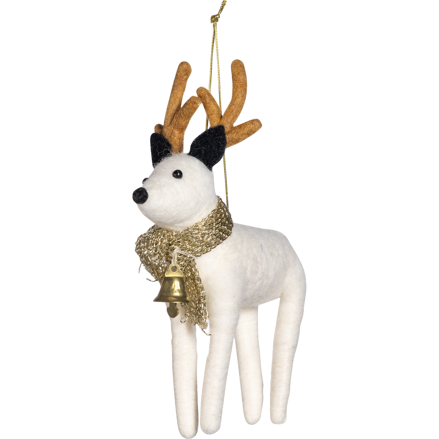 The size of white Pyry reindeer decoration is 14 cm and it is made of polyester and wool.