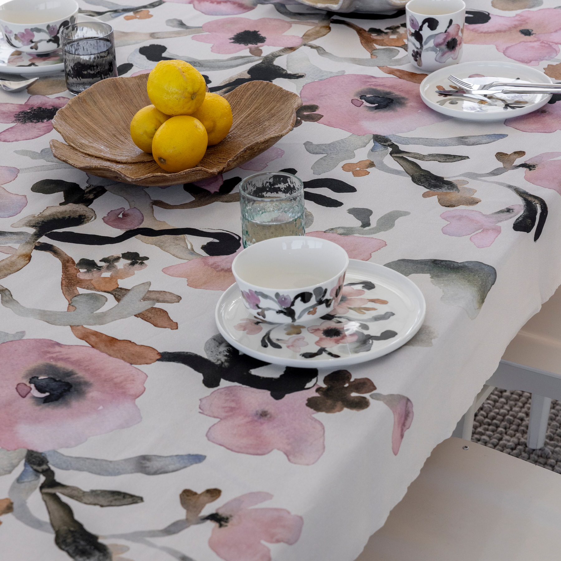 There's something atmospheric in the dreamy gloom of winter. As nature sleeps, the frost paints pastel colours in the sky. The designer Minna Niskakangas has also taken out her colour palette again, mixing the delicate pink with the dark shades of polar night. The ink added to the wet acrylic paint spread smoothly, creating grainy, almost burnt-looking patterns. The flowers of the Ruusumalva (Vervain mallow) pattern spread out from the centre towards the edges like a tree stretching its branches after a long winter's nap. In the home, the Ruusumalva collection spreads in the form of tableware, fabrics, bed linen, kitchen textiles and cushion covers.