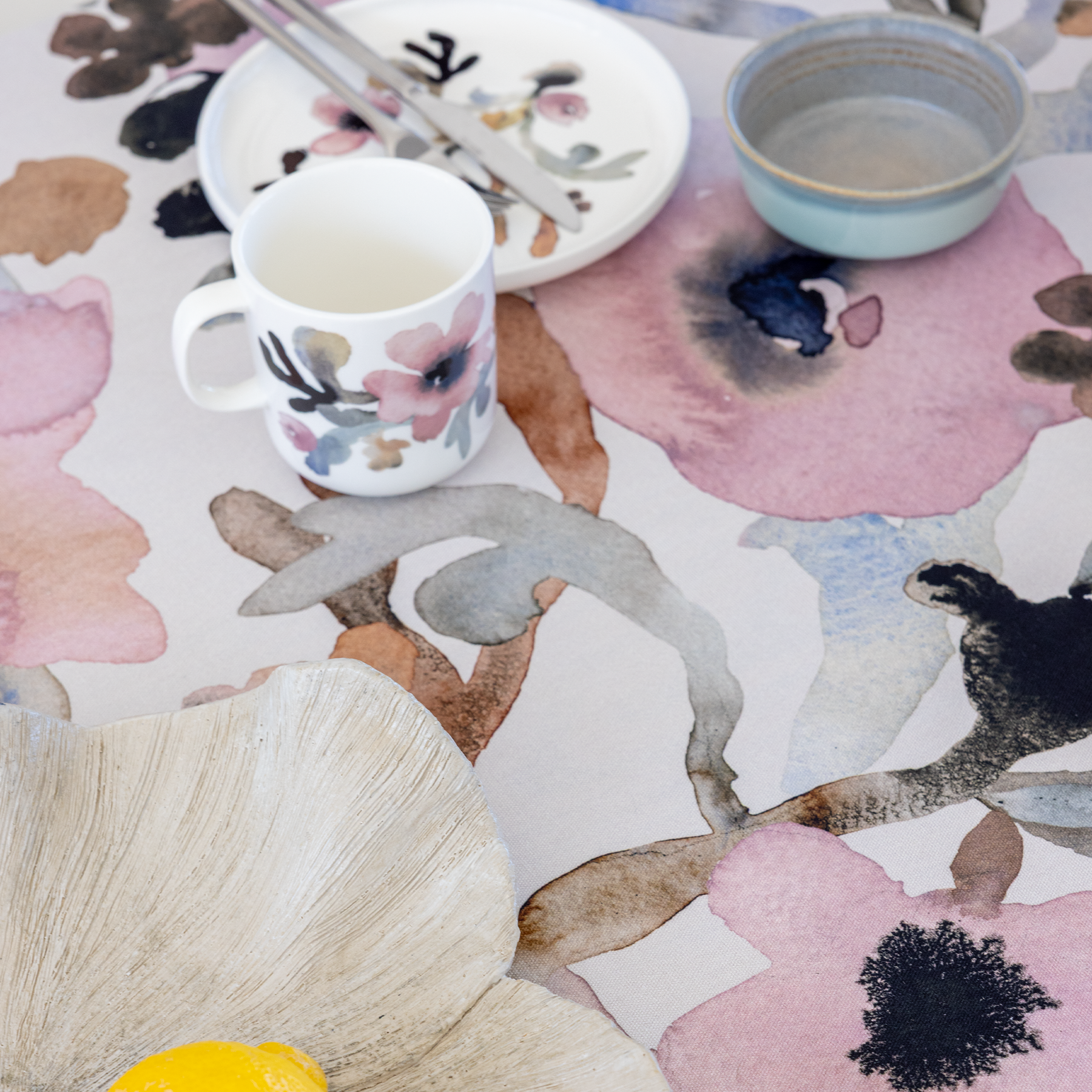 There's something atmospheric in the dreamy gloom of winter. As nature sleeps, the frost paints pastel colours in the sky. The designer Minna Niskakangas has also taken out her colour palette again, mixing the delicate pink with the dark shades of polar night. The ink added to the wet acrylic paint spread smoothly, creating grainy, almost burnt-looking patterns. The flowers of the Ruusumalva (Vervain mallow) pattern spread out from the centre towards the edges like a tree stretching its branches after a long winter's nap. In the home, the Ruusumalva collection spreads in the form of tableware, fabrics, bed linen, kitchen textiles and cushion covers.