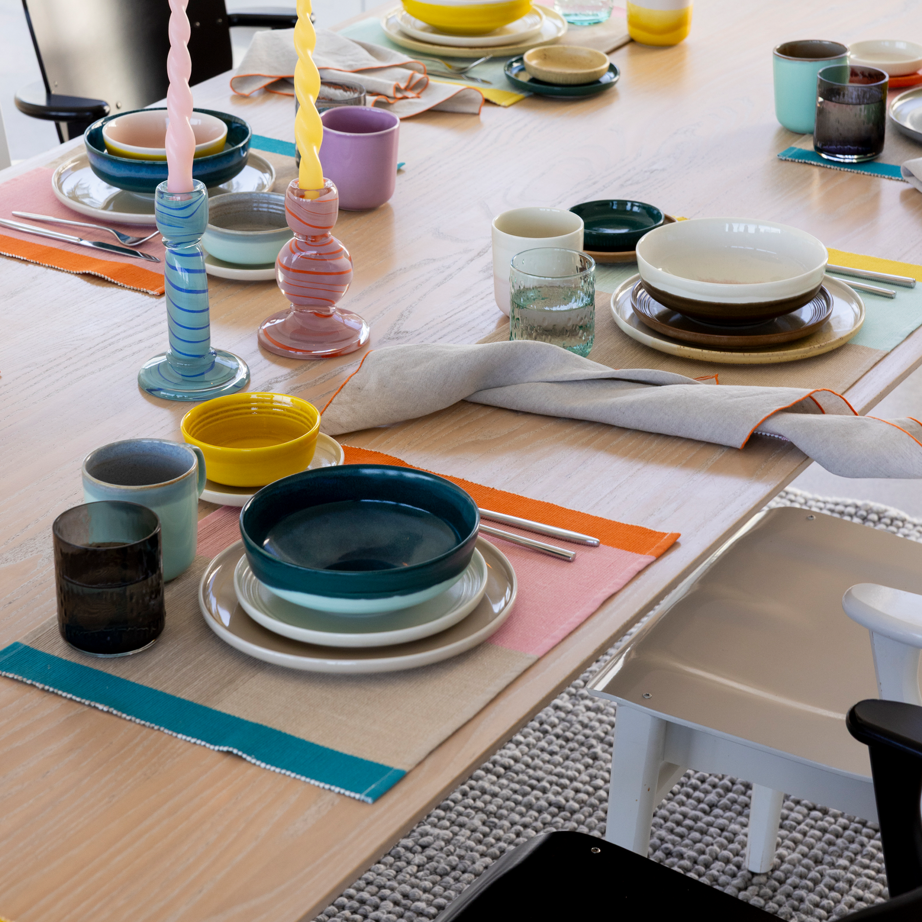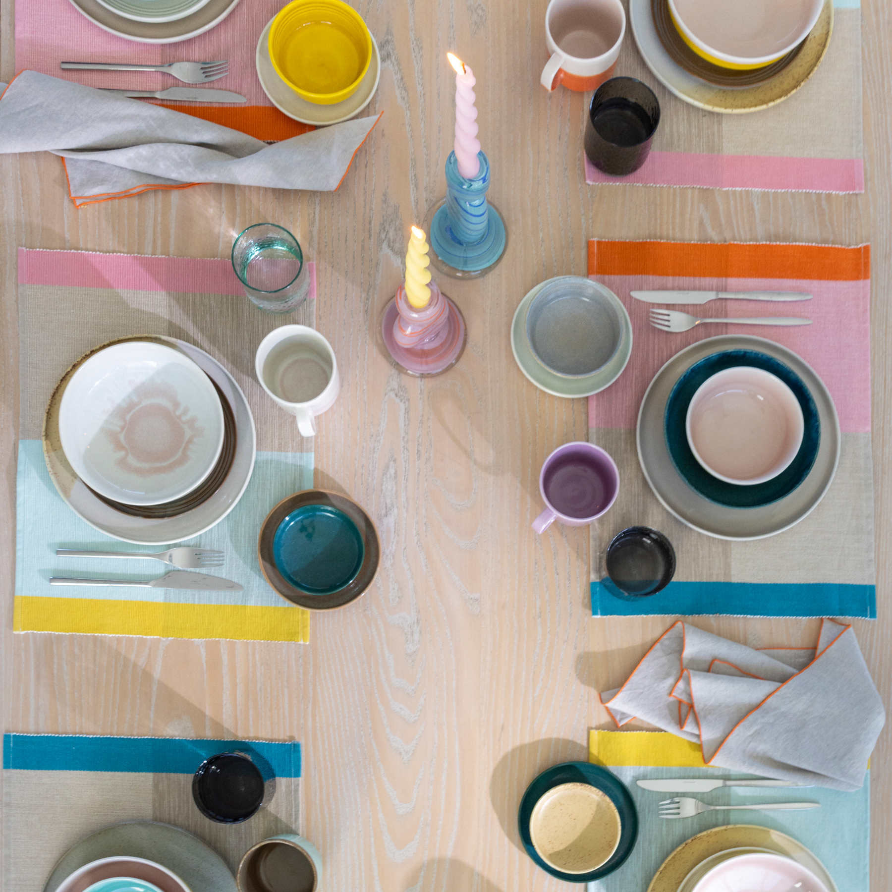 In winter, the colours disappear from the northern nature. Perhaps they fly south with the birds, where they recharge themselves with sunshine and warmth, and return in the spring, brighter than ever. Encouraged by colour, we now decorate our homes exactly as we like. The colours borrowed from Tuntu (Feel) tableware now also shine on textiles, from blankets to table setting and kitchen textiles. Even the Tuntu ribbed placemats alone bring joy, playfulness and colour to the dining room, but they are at their best when paired with other table setting textiles and tableware from the same collection.