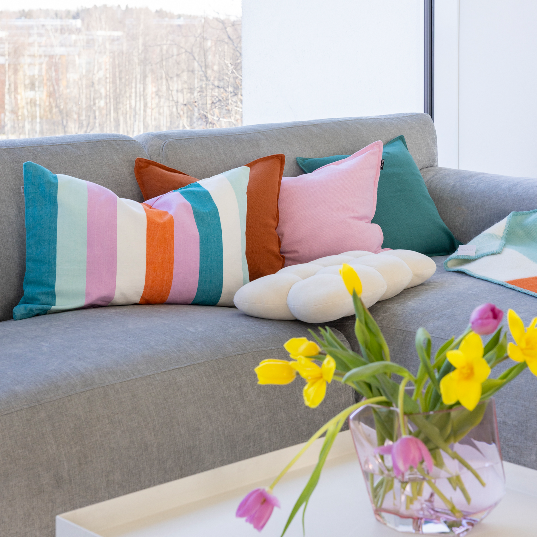 In winter, the colours disappear from the northern nature. Perhaps they fly south with the birds, where they recharge themselves with sunshine and warmth, and return in the spring, brighter than ever. Encouraged by colour, we now decorate our homes exactly as we like. The colours borrowed from Tuntu (Feel) tableware now also shine on textiles, from blankets to table setting and kitchen textiles. Even one Tuntu cushion cover alone brings joy, playfulness and colour to the living room, but it's at its best when paired with other cushion covers or wool blanket from the same collection.
