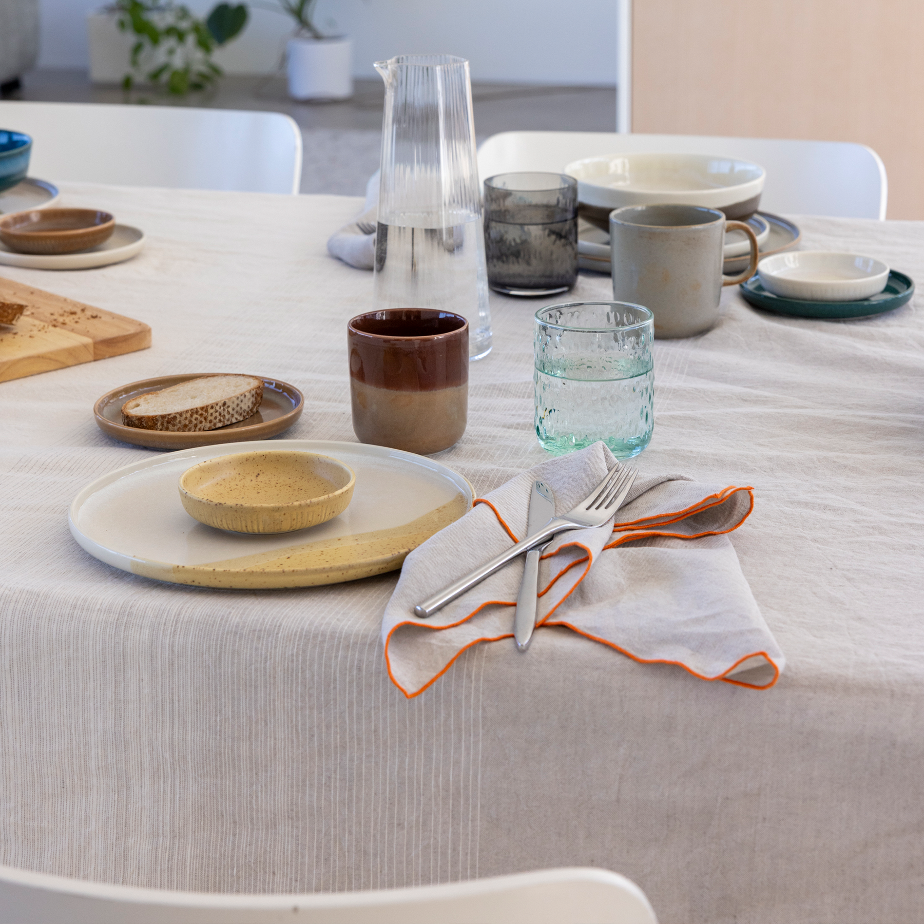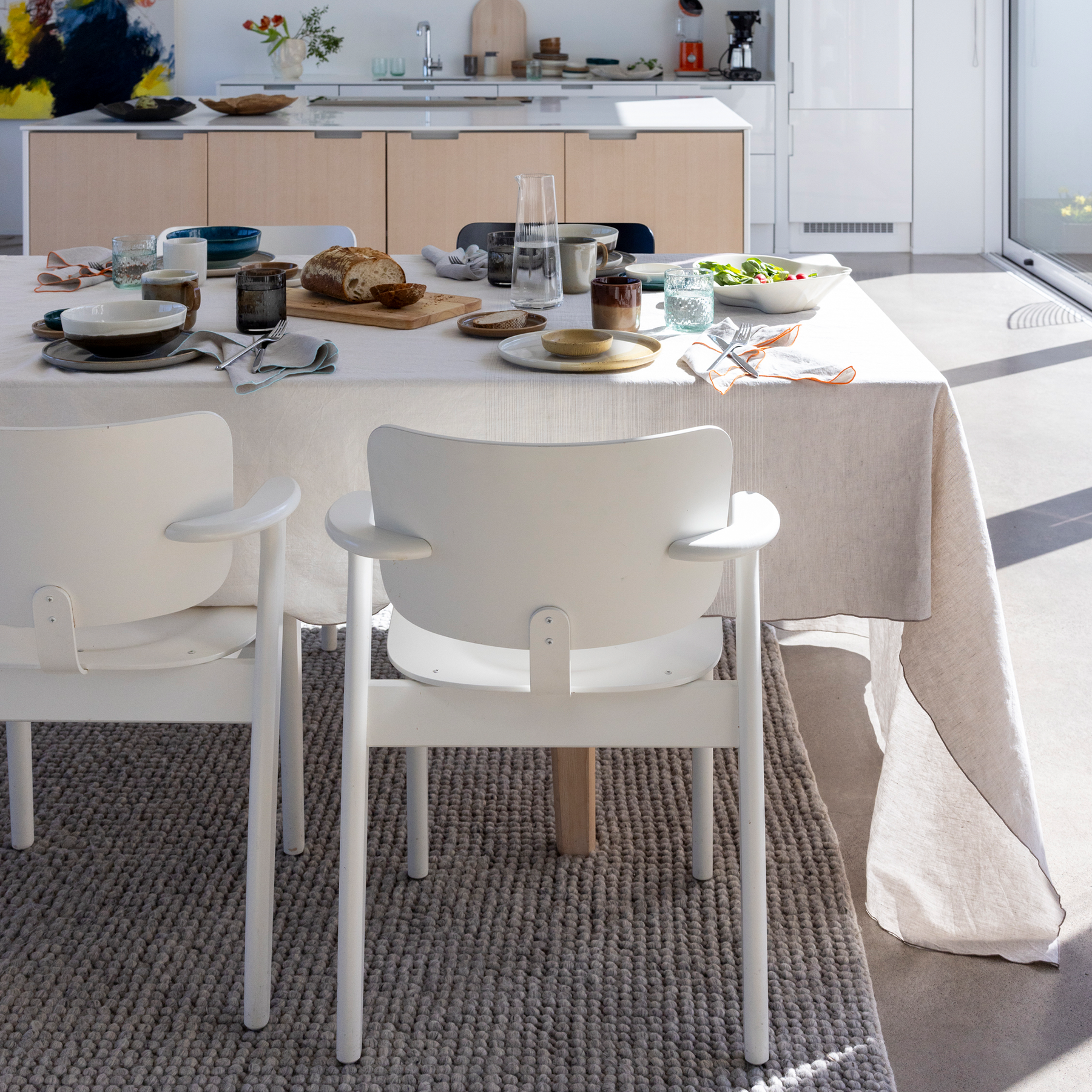 In winter, the colours disappear from the northern nature. Perhaps they fly south with the birds, where they recharge themselves with sunshine and warmth, and return in the spring, brighter than ever. Encouraged by colour, we now decorate our homes exactly as we like. The colours borrowed from Tuntu (Feel) tableware now also shine on textiles, from blankets to table setting and kitchen textiles. Even the Tuntu halflinen tablecloth alone bring joy, playfulness and colour to the dining room, but they are at their best when paired with other table setting textiles and tableware from the same collection.