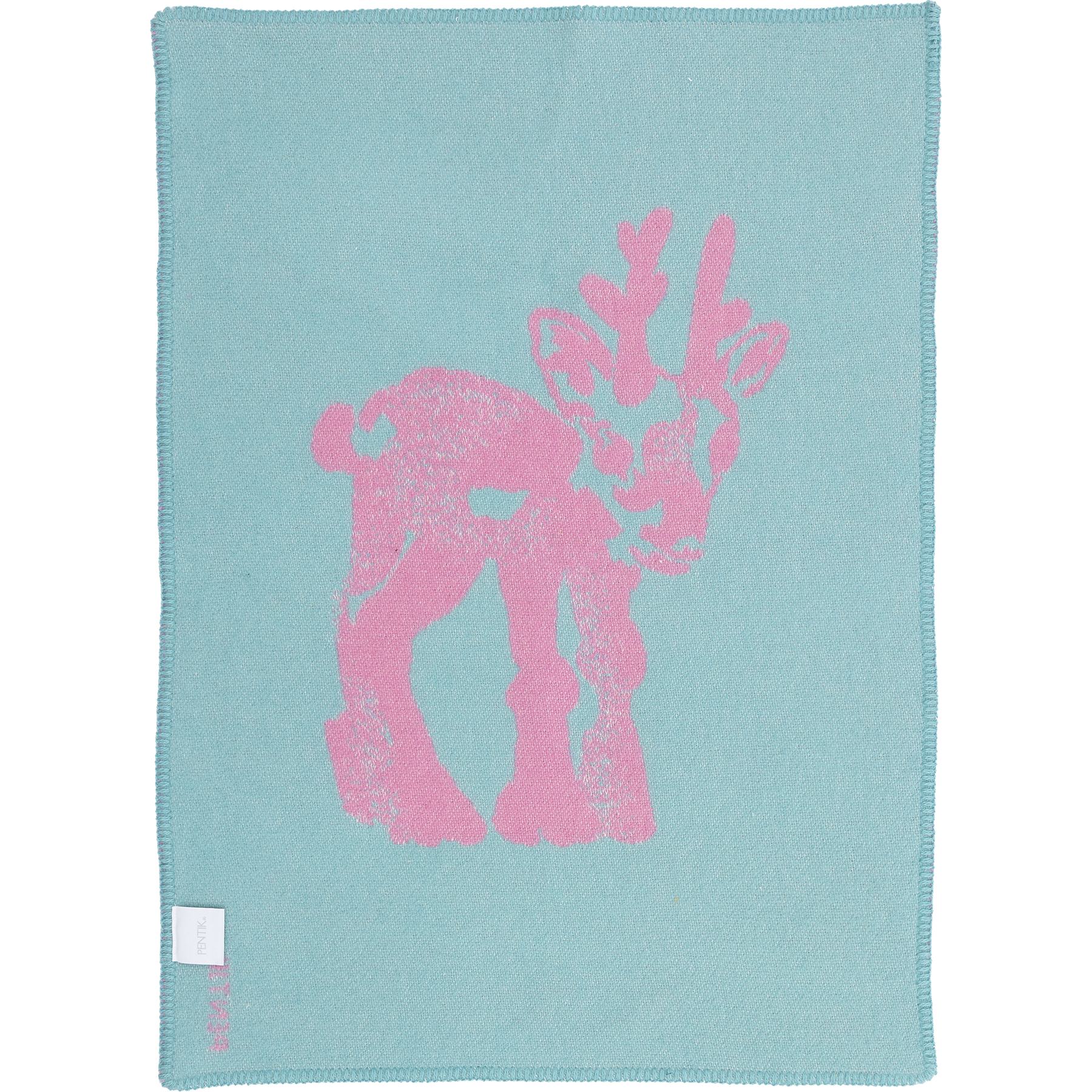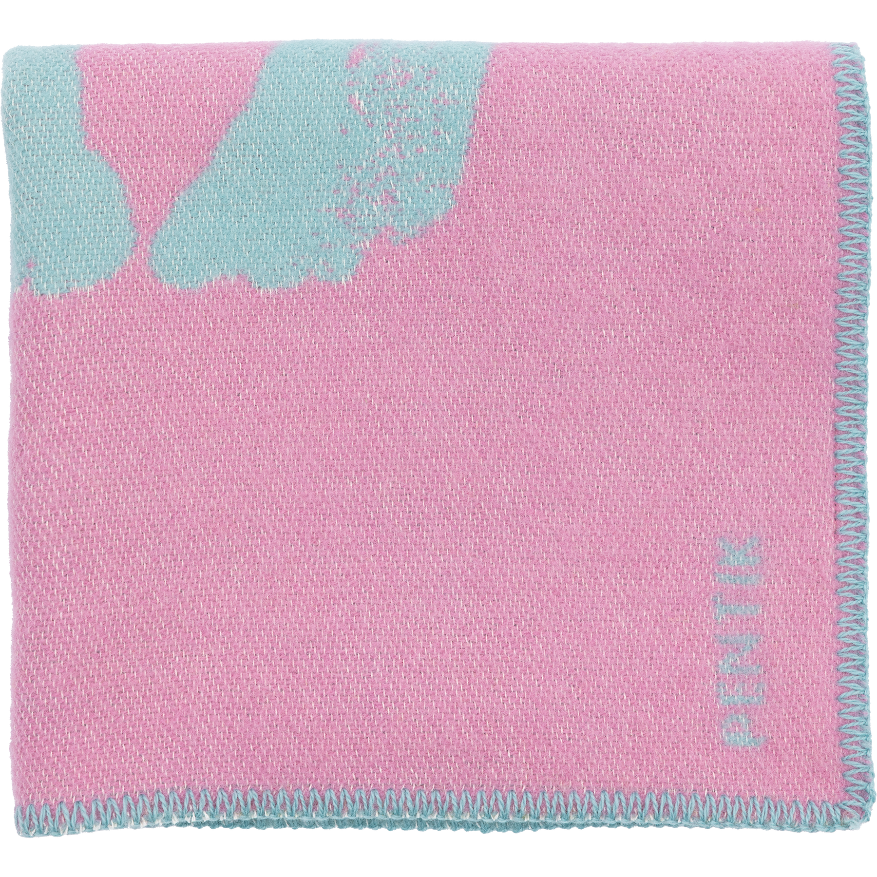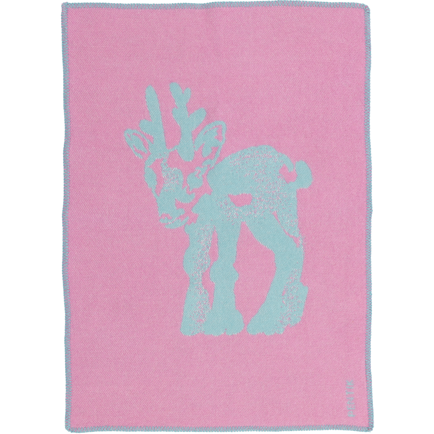The pink-turquoise children's blanket is 65x90 cm in size. The blanket is made of 88% wool and 12% cotton. The colours of the pattern are reversed on the other side.
