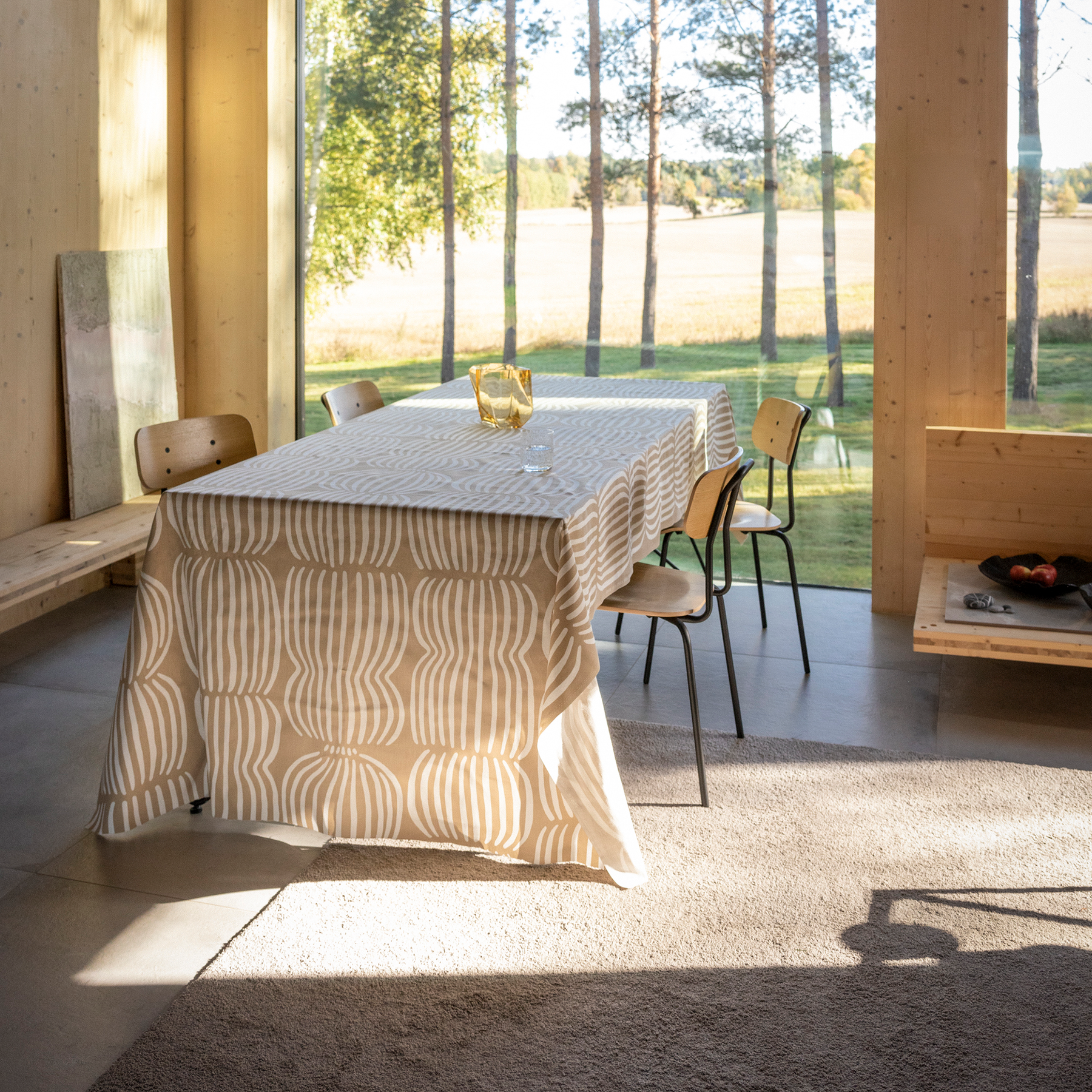 Sun-dappled fields of grain are a hypnotic sight in the north. Now the same experience can be brought home in the form of the pattern of Minna Niskakangas' design. Whether you want to bathe in a field of grain or enjoy a coffee in the middle of one, the pattern is available in everything from sheets to tablecloths and dishcloths. Now the collection is also available in new light brown colour.
