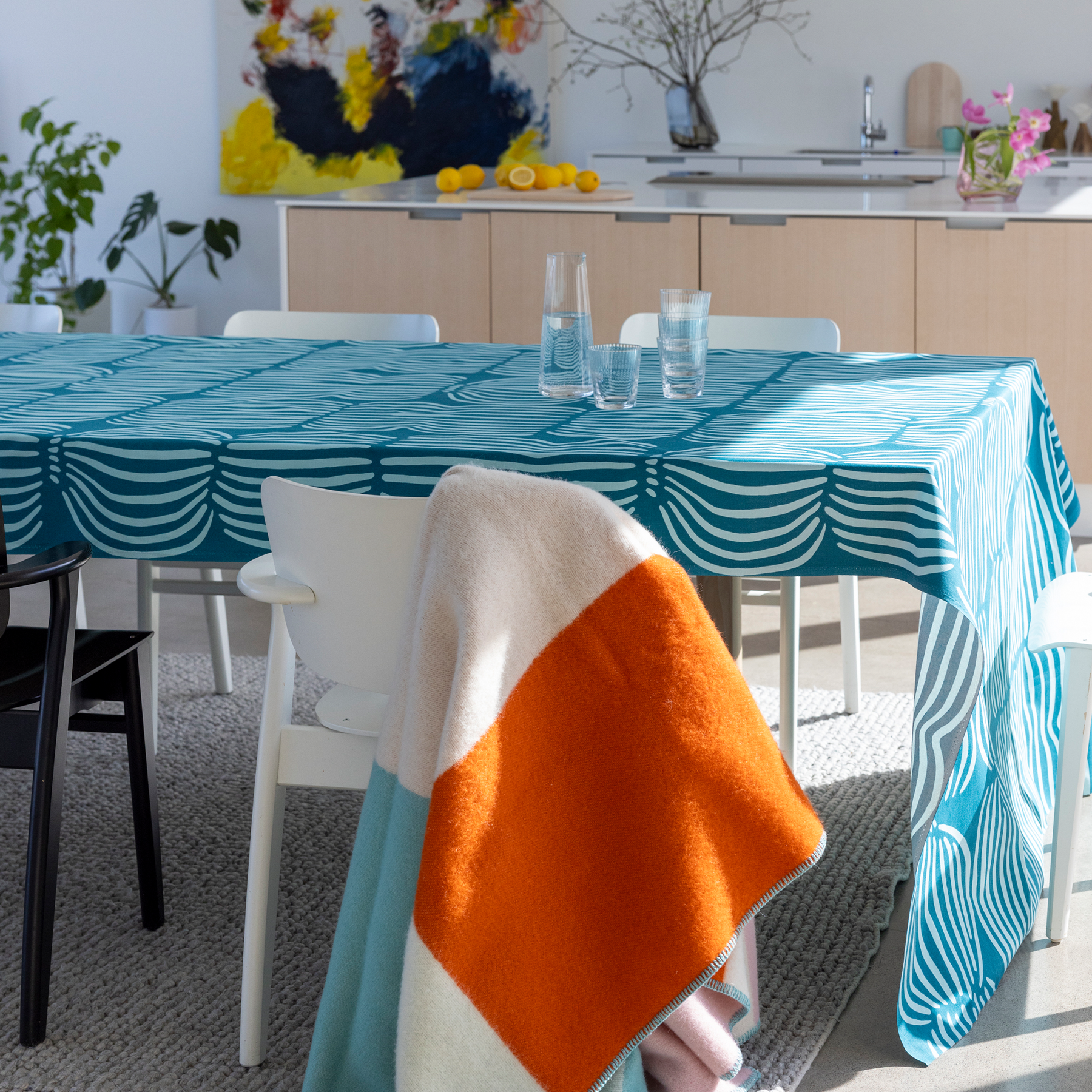 The turquoise Vilja acrylic coated cotton fabric is a practical choice for the dining table as it repels dirt and is easy to wipe clean. The fabric is 150 cm wide.