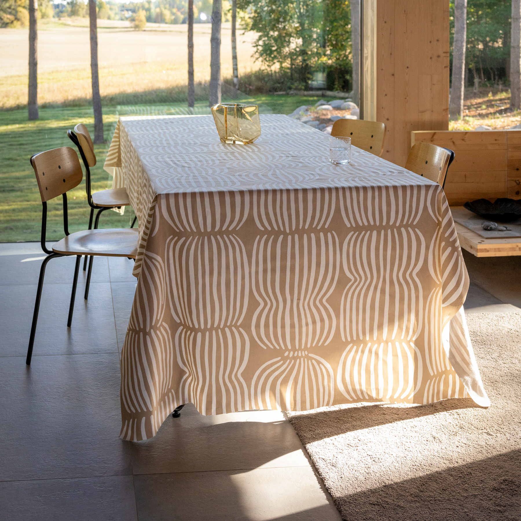 Sun-dappled fields of grain are a hypnotic sight in the north. Now the same experience can be brought home in the form of the pattern of Minna Niskakangas' design. Whether you want to bathe in a field of grain or enjoy a coffee in the middle of one, the pattern is available in everything from sheets to tablecloths and dishcloths. Now the collection is also available in new light brown colour.