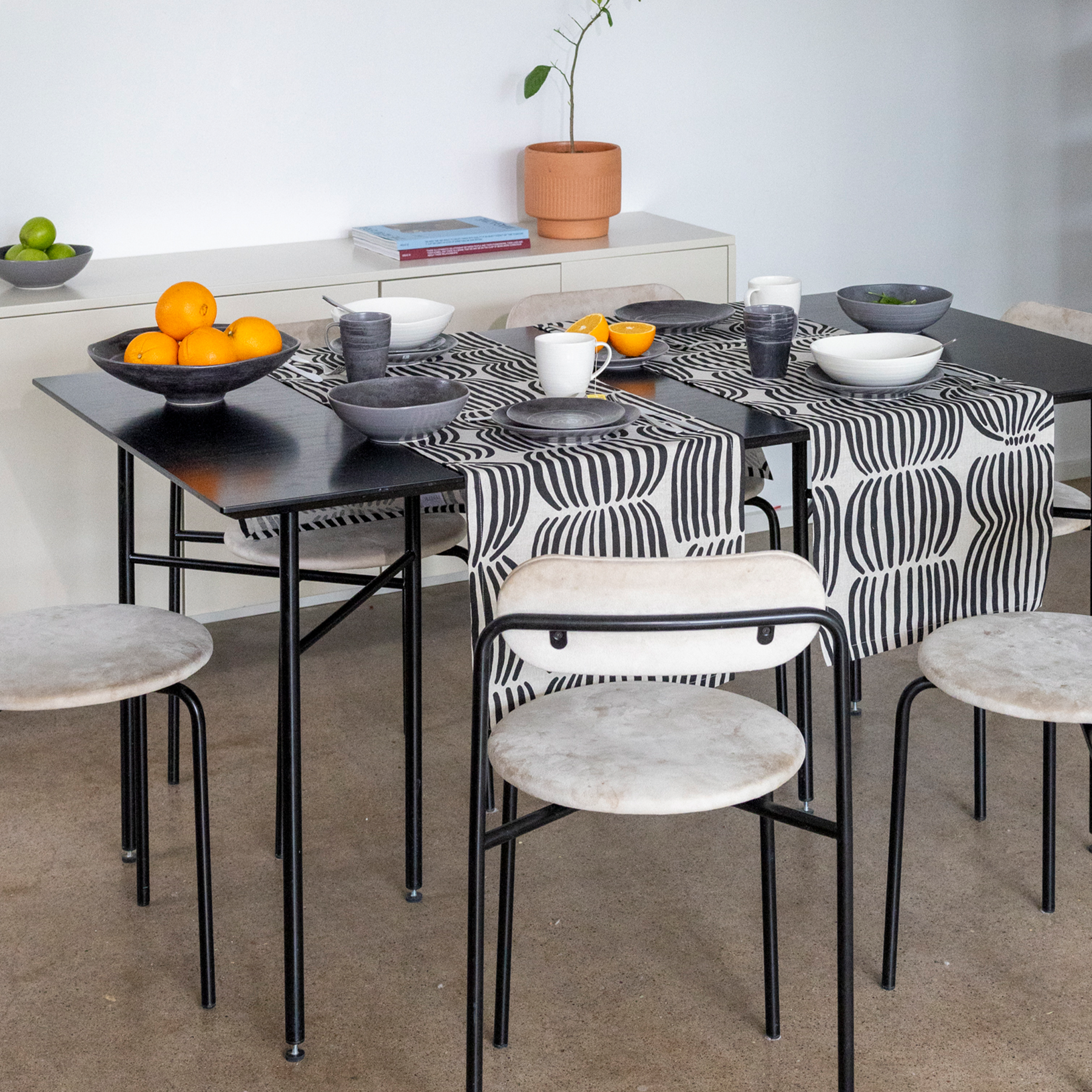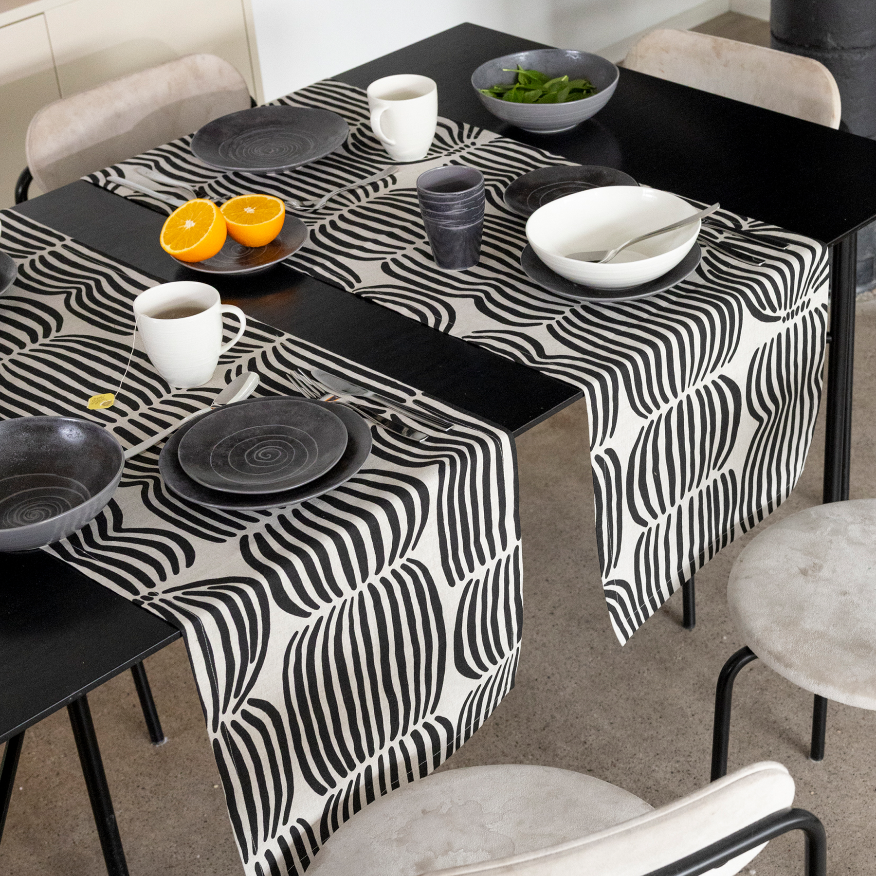 Fields of ripe grain swaying in the late-summer breeze is a hypnotic sight that’s unique to the north. Now you can bring that experience home with the black version of Minna Niskakangas’s classic print. The Vilja pattern is printed on a high-quality and natural-coloured linen blend fabric. Whether you’d like to drift off to sleep or enjoy your morning coffee surrounded by fields of grain, you’ll find the Vilja pattern on everything from kitchen textiles to fabric to mugs.
