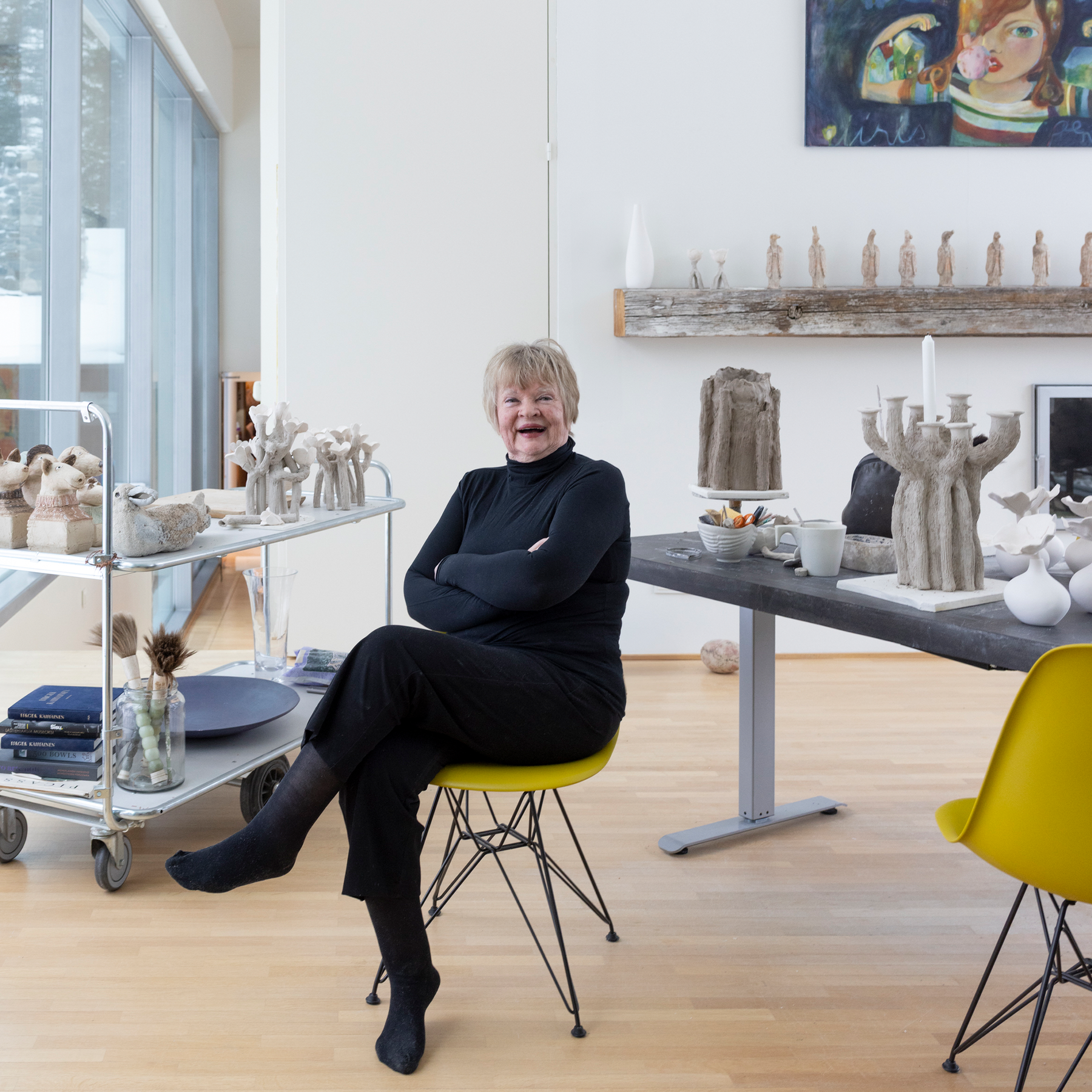 The dandelion seeds floating in the air symbolise the seeds of a dream for ceramic artist Anu Pentik. They travel with the wind for a time and chance determines where they will eventually land. "You never know. Some seeds sink into good soil, others don't. But there is always hope," Anu believes. In the end, they sprout beauty – dreams that come true. Lasse Kovanen painted a pattern based on Anu's Dandelion sculptures, glowing with strong, warm and encouraging shades of yellow. The Voikukka (Dandelion) collection includes fabrics, tablecloths and cushion covers, as well as Studio ceramics designed by Anu.