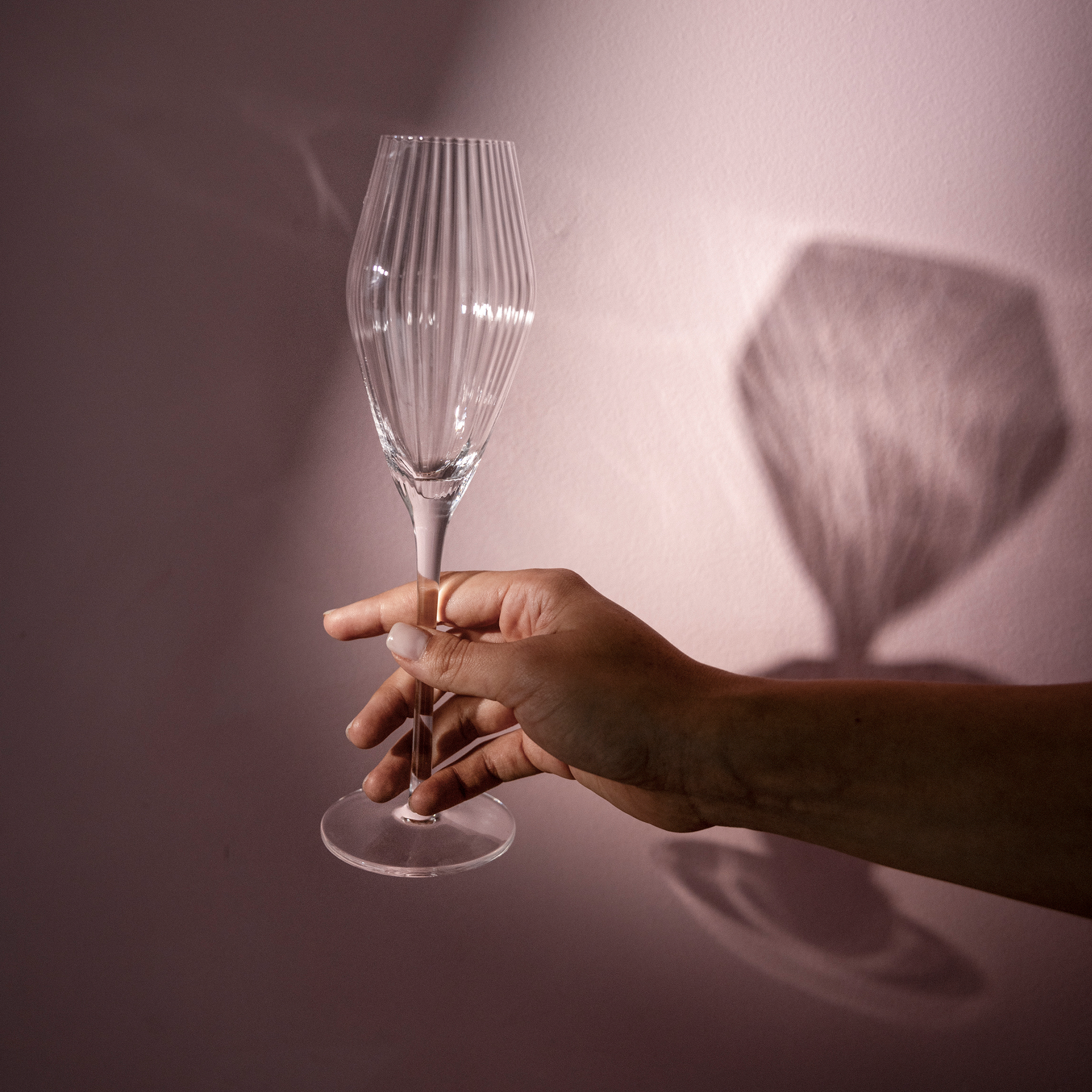 After the spring floods, mirror-clear but freezing cold water runs and swirls almost silently in the streams of the northern rivers. The smooth, calmly flowing water is something you can't help but be mesmerised by for a long time. The soft but angular shapes of the Vuolle champagne glasses designed by Lasse Kovanen, also catch the eye. The striped champagne glasses are made of mouth-blown glass.