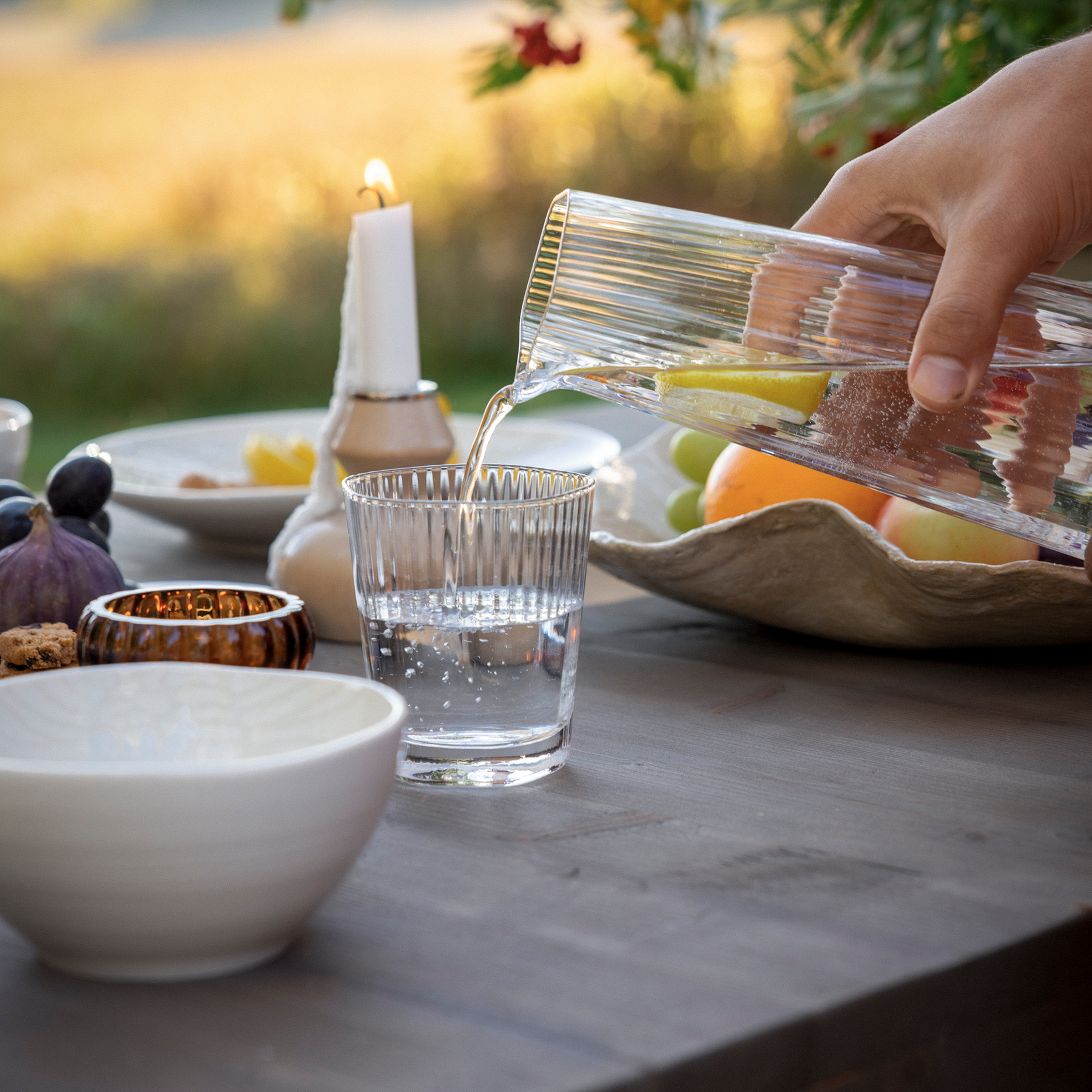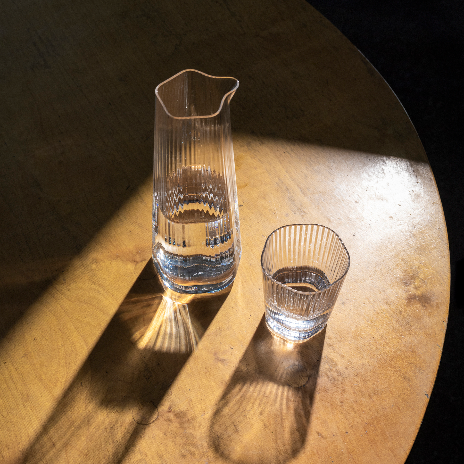 After the spring floods, mirror-clear but freezing cold water runs and swirls almost silently in the streams of the northern rivers. The smooth, calmly flowing water is something you can't help but be mesmerised by for a long time. The soft but angular shapes of the Vuolle decanter designed by Lasse Kovanen, also catch the eye. The striped decanter is made of mouth-blown glass.