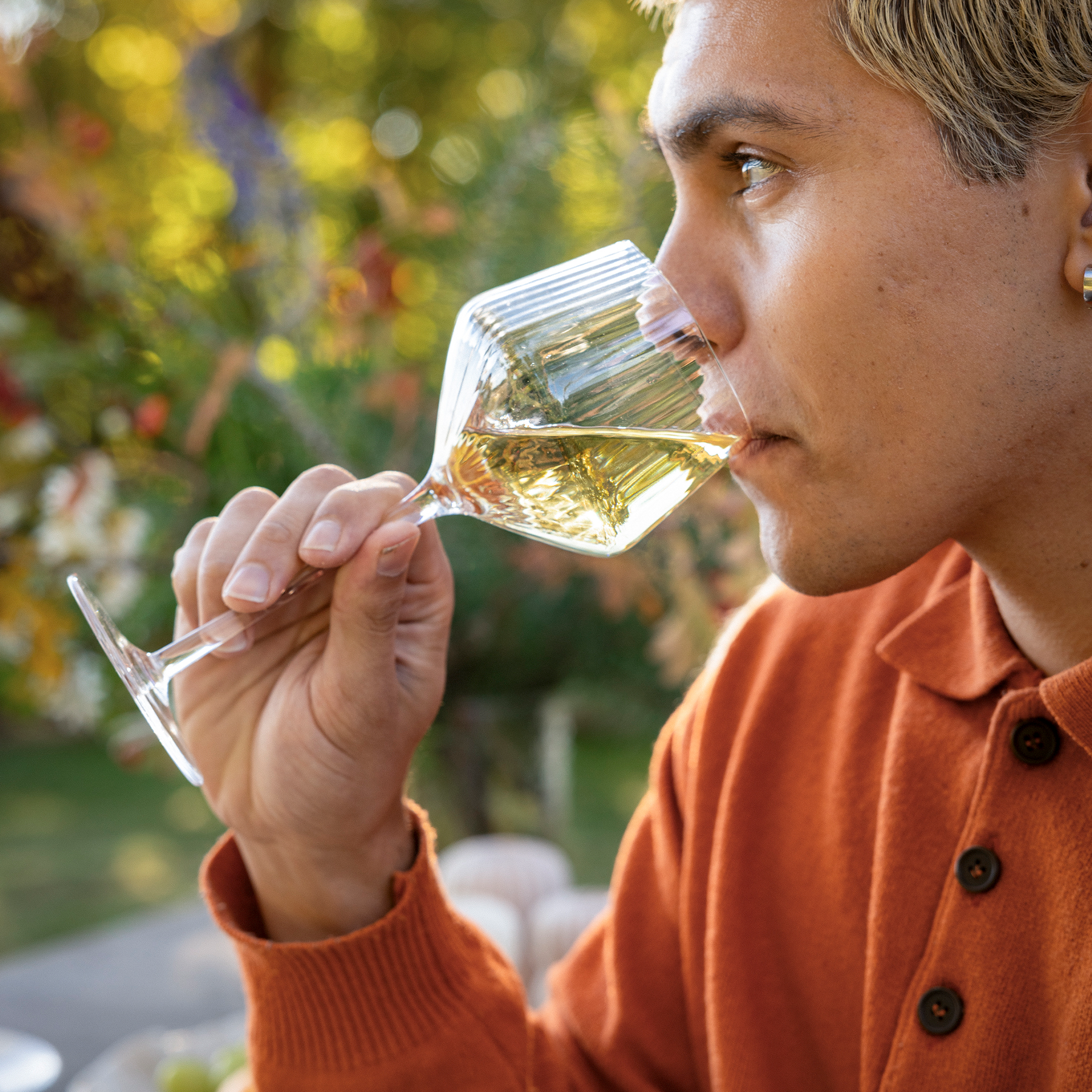 After the spring floods, mirror-clear but freezing cold water runs and swirls almost silently in the streams of the northern rivers. The smooth, calmly flowing water is something you can't help but be mesmerised by for a long time. The soft but angular shapes of the Vuolle wine glasses designed by Lasse Kovanen, also catch the eye. The striped white wine glasses are made of mouth-blown glass.